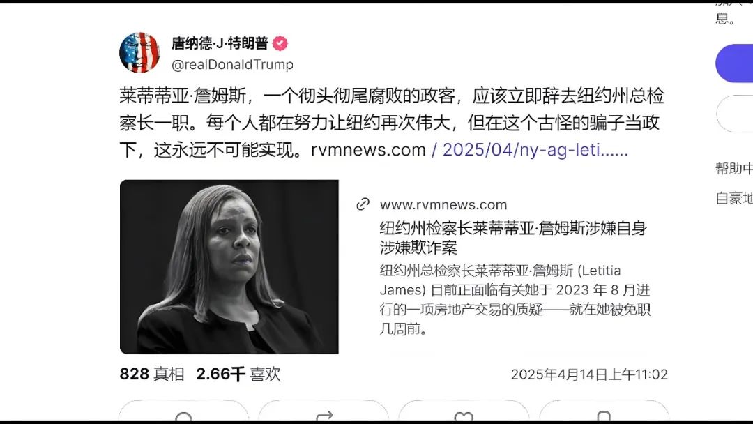 《纽约邮报》获得的内部文件显示,调查内容包括詹姆斯办公室是否“非法获取特朗普的税务记录”“是否接受外部资金干预调查”——但这些指控,跟当年詹姆斯调查特朗普的理由几乎一模一样,被媒体称为“以彼之道还施彼身”的拙劣模仿。