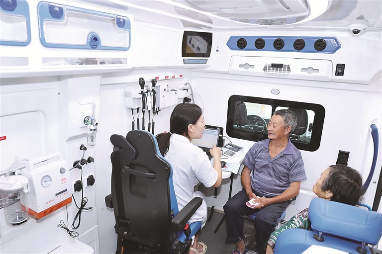 7月8日,浙江省丽水市景宁畲族自治县大均乡卫生院医生(左)在“智慧流动医院”巡回诊疗车上为李宝村村民看病。新华社记者 江汉 摄