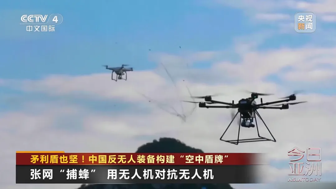 这是一架体格庞大的6旋翼无人机,机身下方挂载了两个特殊的发射器,一旦进入它的攻击范围,无人机只能束手就擒。大型无人机突然喷出一张面积达到16平方米的大网,小型无人机的桨叶瞬间被死死缠住,失去动力、坠向地面。