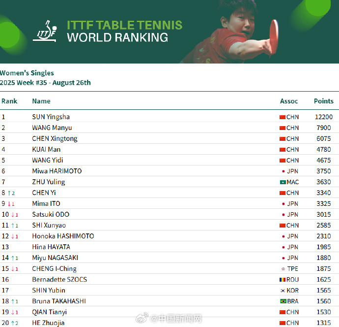 女单:孙颖莎12200分、王曼昱、陈幸同、蒯曼、王艺迪位列前五,陈熠第8
