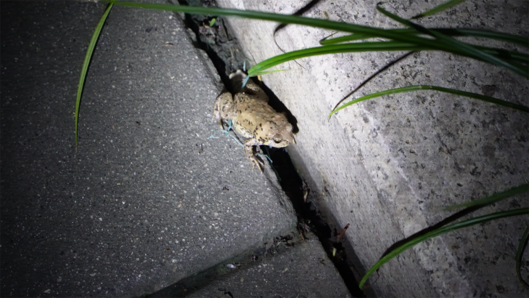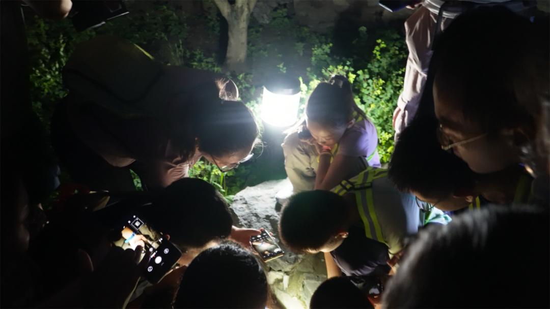 在手电光下,金绿宽盾蝽闪耀着绚丽的色彩;岩石缝里,无蹼壁虎正在等待蚊虫大餐的到来。最令人称奇的是当队伍路过一处路面时,这里竟聚集着十余只中华蟾蜍。“中华蟾蜍比较笨拙,行动缓慢,不善于游泳和跳跃,常匍匐爬行,由于它后肢短,因而只能做短距离的跳跃。”导师的解说颠覆了许多家长的认知。