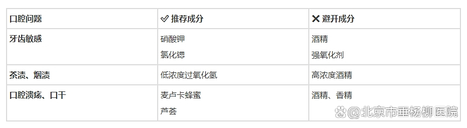 口干人群可选含麦卢卡蜂蜜的漱口水,需要佩戴义齿的人群优选木糖醇成分以抑制念珠菌,避开酒精和强刺激成分。