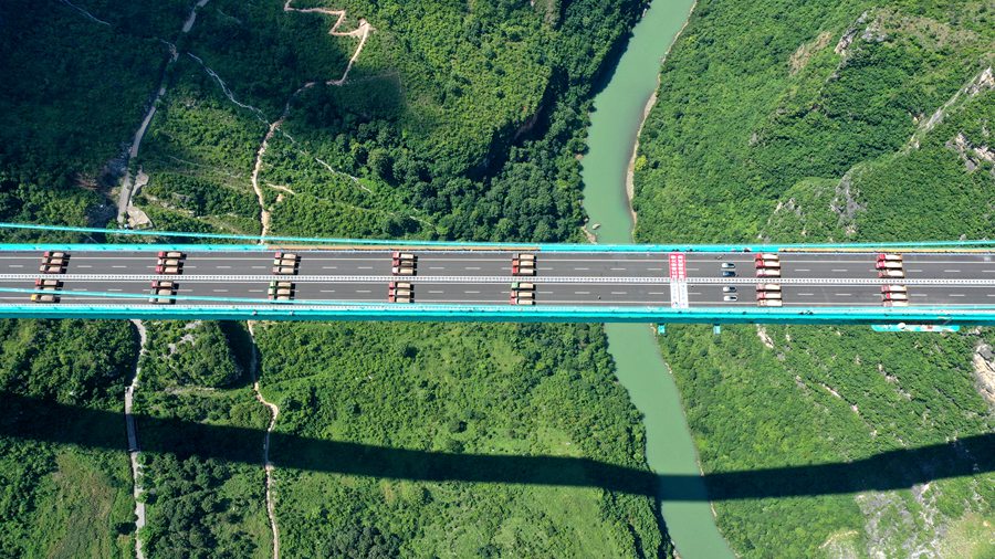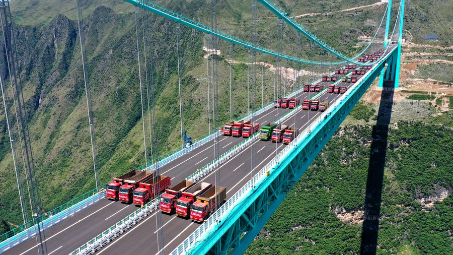 8月25日航拍的花江峡谷大桥荷载试验现场。新华网 周远钢 摄