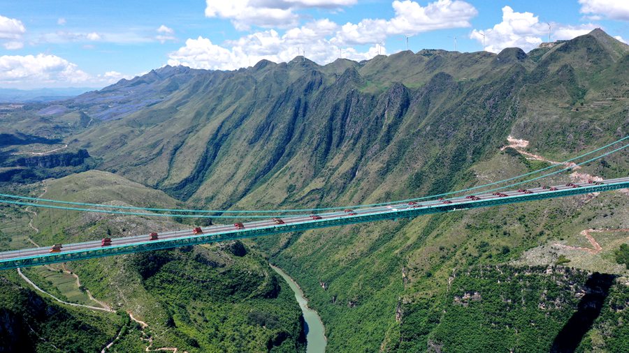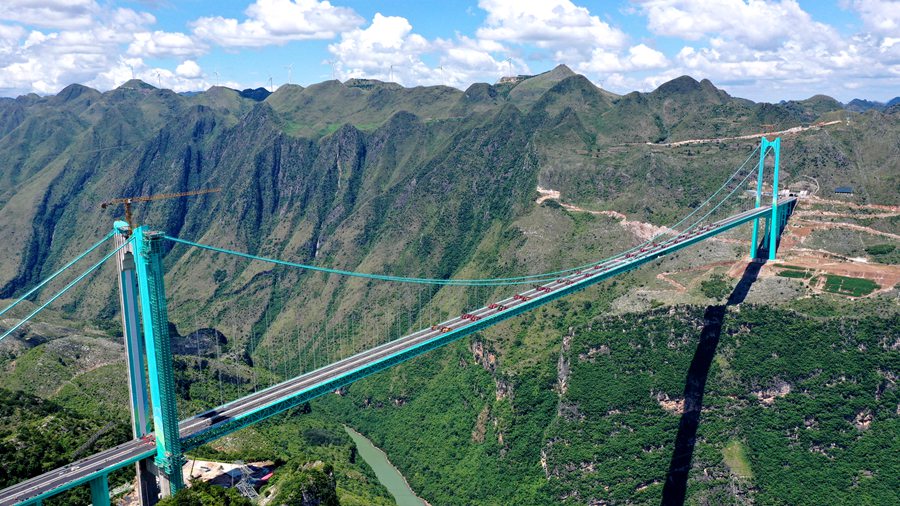 花江峡谷大桥全长2890米,主桥跨径1420米,桥面到水面高度625米,建成后主桥跨径居山区桥梁跨径世界第一、桥梁高度居世界第一。大桥预计9月底建成通车,对助力贵州省经济发展,加快资源互通具有重要意义。