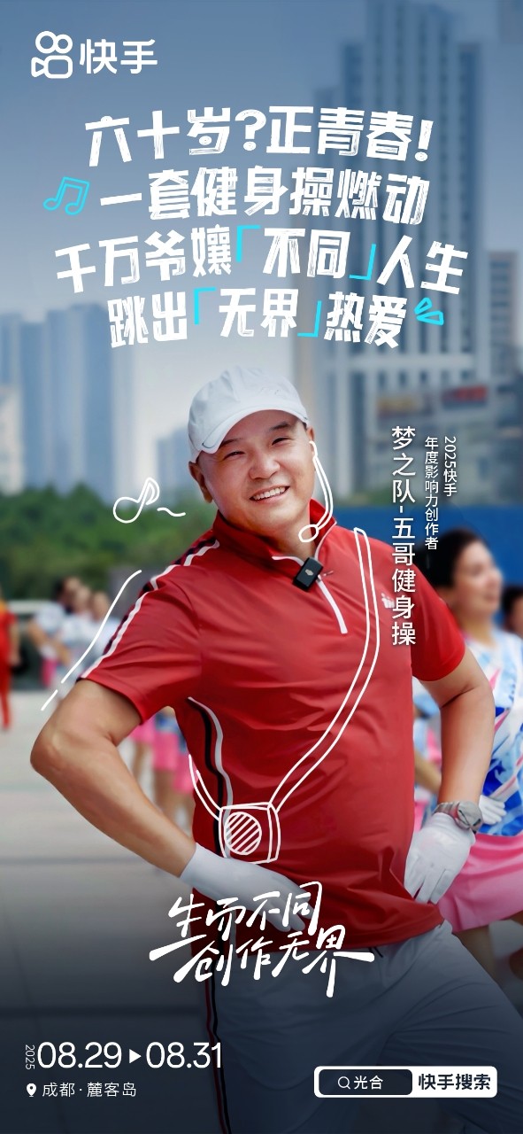 五哥的故事也被越来越多的人看到,人民日报、央视新闻等媒体纷纷进行了报道,而五哥作为快手体育达人代表被邀请参加8月29日至31日在成都举办的“2025快手光合创作者大会”,分享自己如何在快手带领千万老铁跳出快乐人生。60岁的五哥,依然有着年轻人的精神头,不被年龄定义的他,也让更多人因梦操打破对中老年人的偏见,向着快乐与健康再出发。