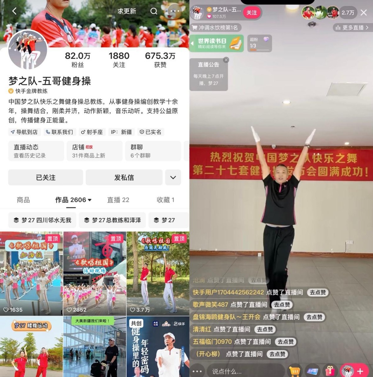 2019年4月,五哥入驻快手,开始在快手上教操。在他的直播间里,总是热闹非凡,每次发布新操,都不用推广,同时在线观看人数就能达到三万多人。无法在线下相聚的队员们,在线上有了重逢的机会。如今,五哥在快手上已经收获82万粉丝,23个粉丝群,越来越多老铁爱上健身,跟着他的节奏舞动身体,享受运动带来的快乐。不仅如此,很多梦之队的领操员、普通队员也跟着五哥入驻了快手,记录自己的跳操日常。