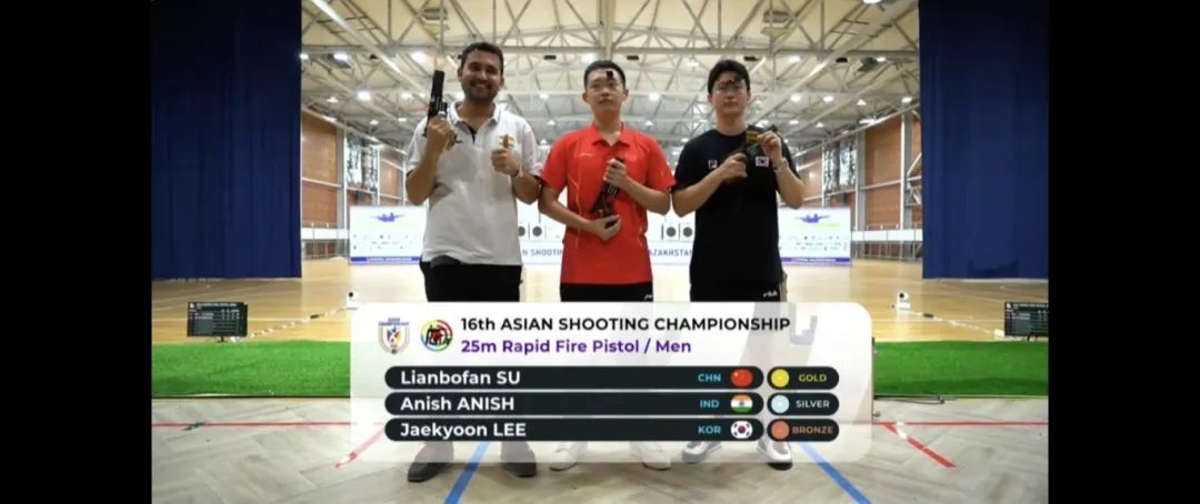 在团体比赛中,苏连博凡和姚家楠、王仕文代表中国队摘得25米手枪速射男子团体铜牌,金牌归属于韩国队。