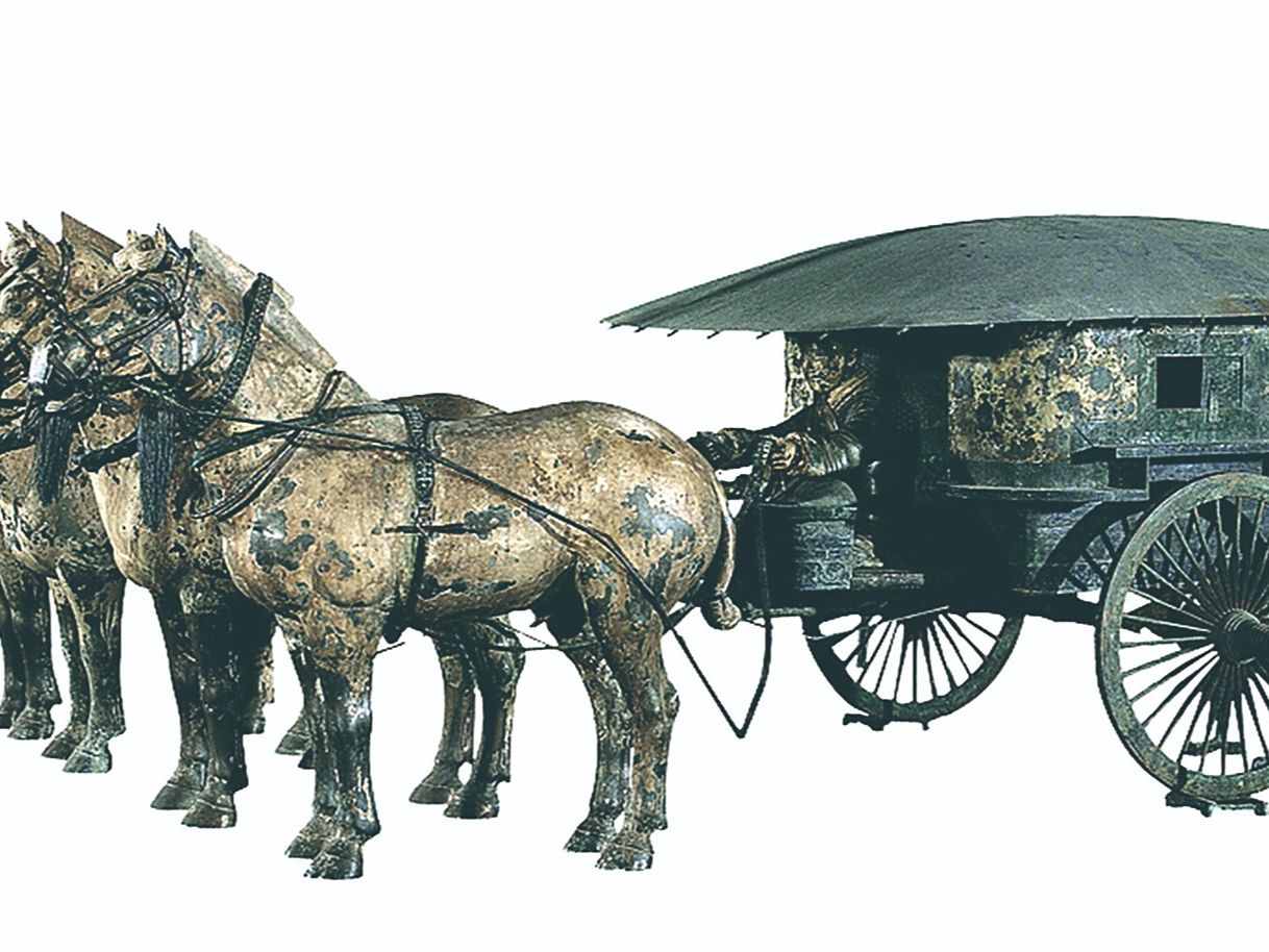 1980年,考古人员在陕西秦始皇帝陵封土西侧勘察时,发掘清理出了两乘大型彩绘铜车马,一前一后置于同一木椁中,前面的一辆称为1号车,后面的一辆称为2号车。两辆铜车马出土时均已被压碎,1号车破碎成1325片,2号车破碎成1685片。铜车马的车、马和俑大小相当于真车、真马、真人的二分之一,为20世纪考古史上发现的结构最为复杂、形体最为庞大的古代青铜器,被誉为中国古代的“青铜之冠”。详情>>