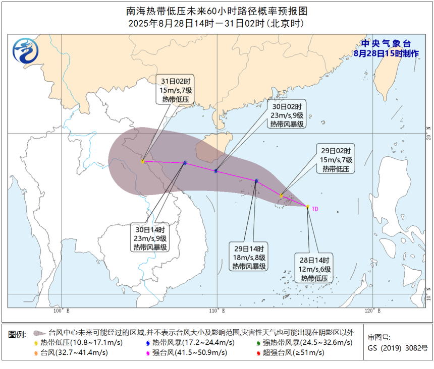 今天(8月28日)下午14时,南海热带低压生成,可能加强为今年第14号台风“蓝湖”。未来它将呈西北行路径,或掠过我国海南岛登陆越南沿海。无论该热带低压强度如何、是否登陆我国,它都将给华南沿海带来持续性台风雨,今起三天广东、海南多地将现大雨到暴雨,局地有大暴雨。