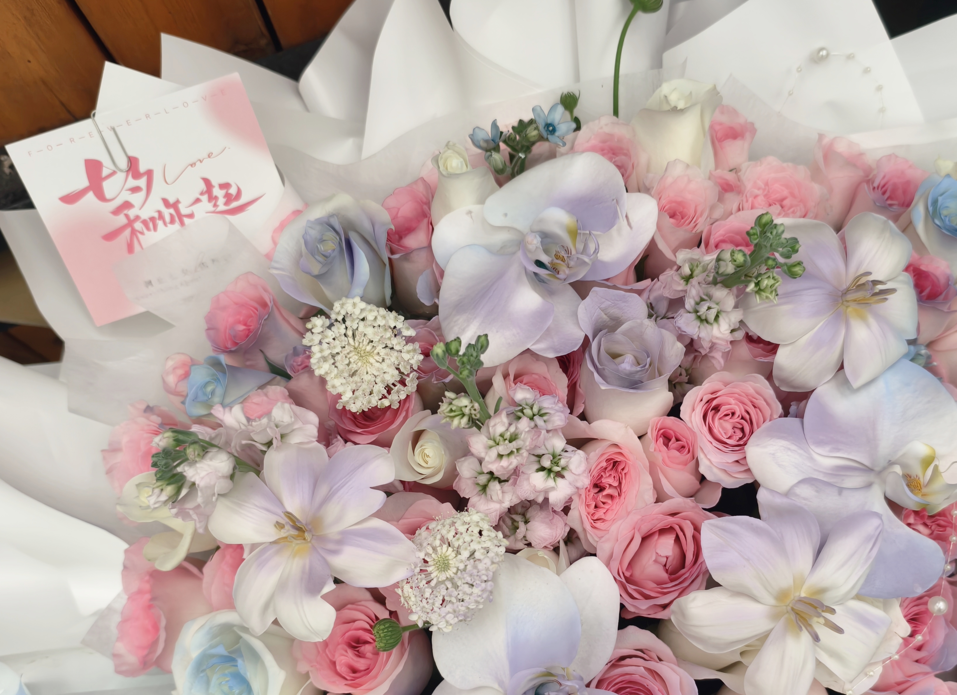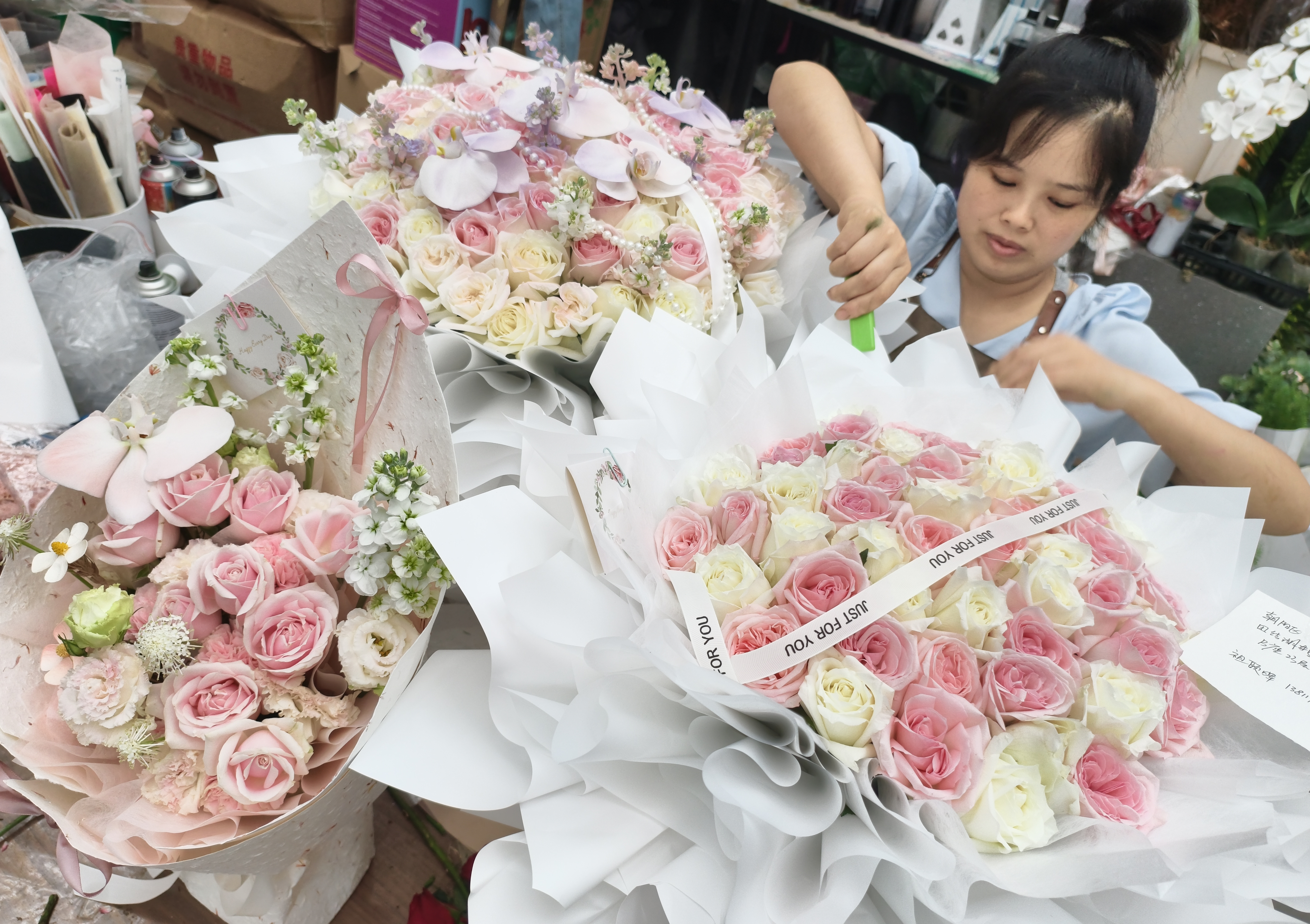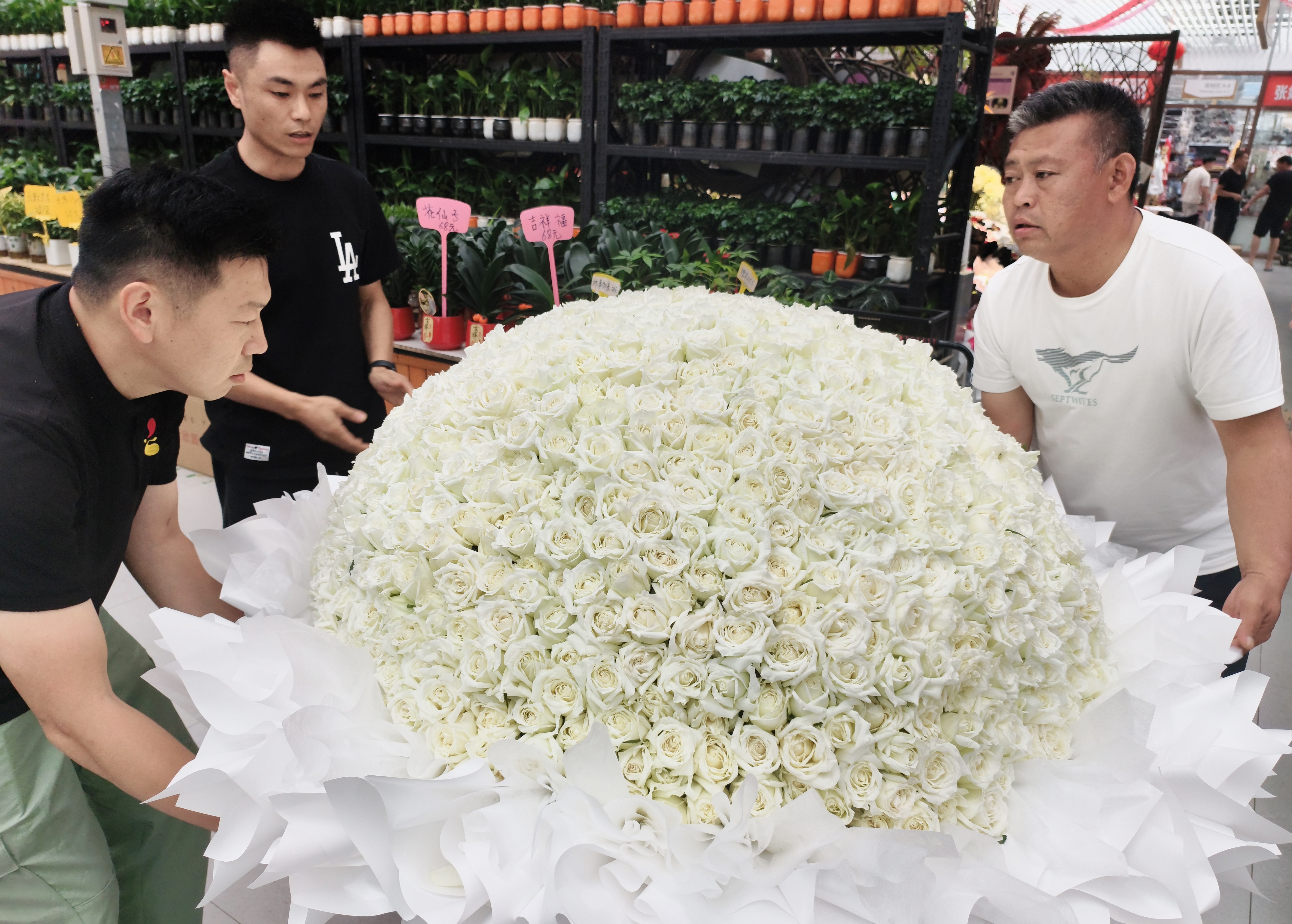 其中一家花卉经销商花了三个多小时为客户精心制作了一株999朵白玫瑰组成的花束。