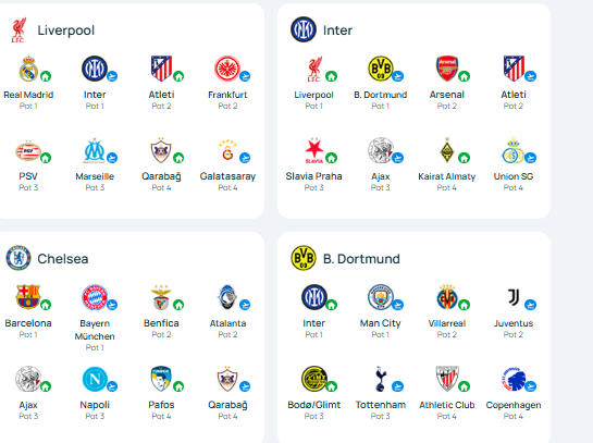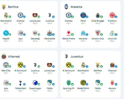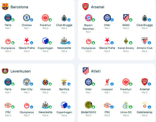 抽签仪式揭晓后,各支球队第一阶段对阵揭晓。上届冠军巴黎圣日耳曼队的8场比赛有7场将对阵来自五大联赛的球队。其中一档球队方面,他们将在主场迎战德甲劲旅拜仁慕尼黑队,在客场挑战西甲冠军巴塞罗那队。
