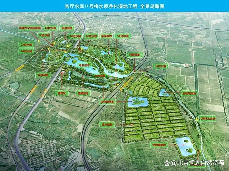 滩地湿地化改造,形成水质净化湿地。滩地改造为水质净化表流湿地156.1平方千米,湿地岸坡绿化约43.2平方千米,注重水质净化效能,生物多样性营造,湿地景观营造。八号桥水质净化湿地,采用表流型湿地工艺,因地制宜利用现状滩地,退耕还湿,设计溪流、湖泊、沼泽、岛屿、浅滩、生物塘、森林、渗滤带、梯田等多类型湿地,蓝绿交织、林水相融,净化永定河河水,最大净化量26万立方米,提高入库水质,减少入库污染,涵养水源,保持水土,增绿增水,提高永定河入库口生态环境质量。