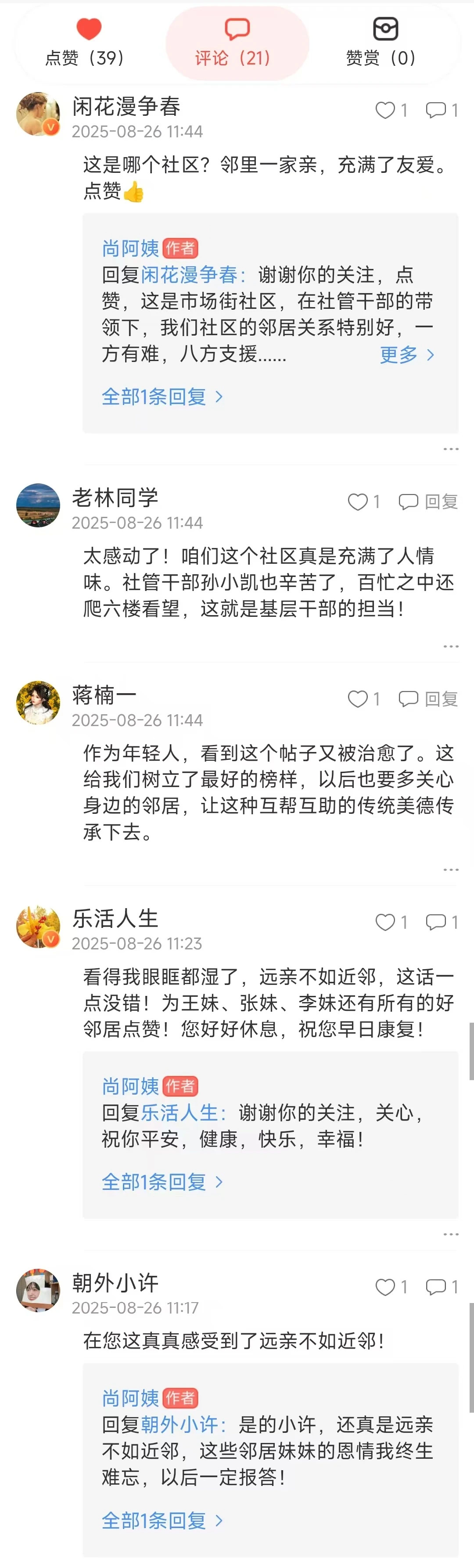 几天后,尚小兰能慢慢下床活动了,回想起这段时间大家的帮助,心里满是感激。她在朝外街道的“伴儿”APP上发了一封表扬信,将这份温暖记录下来:“我把这些事写出来,就是想让她们知道,这份情谊我一直记在心里。”