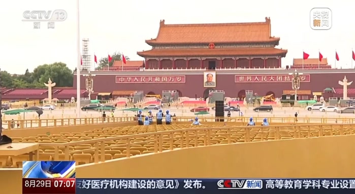 目前,天安门广场核心区布置已基本就绪。广场上新增了临时观礼台,现场布置也与周围的建筑、环境协调统一,凸显仪式的恢弘庄严。