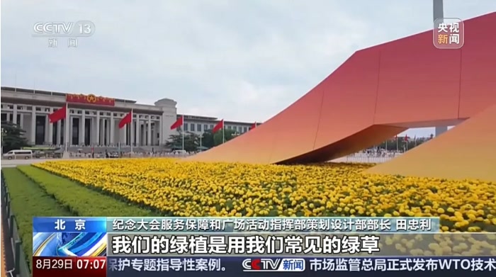 纪念大会服务保障和广场活动指挥部策划设计部部长田忠利介绍,黄花是黄色孔雀草,绿植是常见的绿草,红色是四季秋海棠。整个色彩更加趋于单纯化,体现庄重庄严的艺术效果。像围合整个观礼台的绿植,上面设计有长城纹来烘托主题,使整个广场更加饱满生动,体现艺术性。