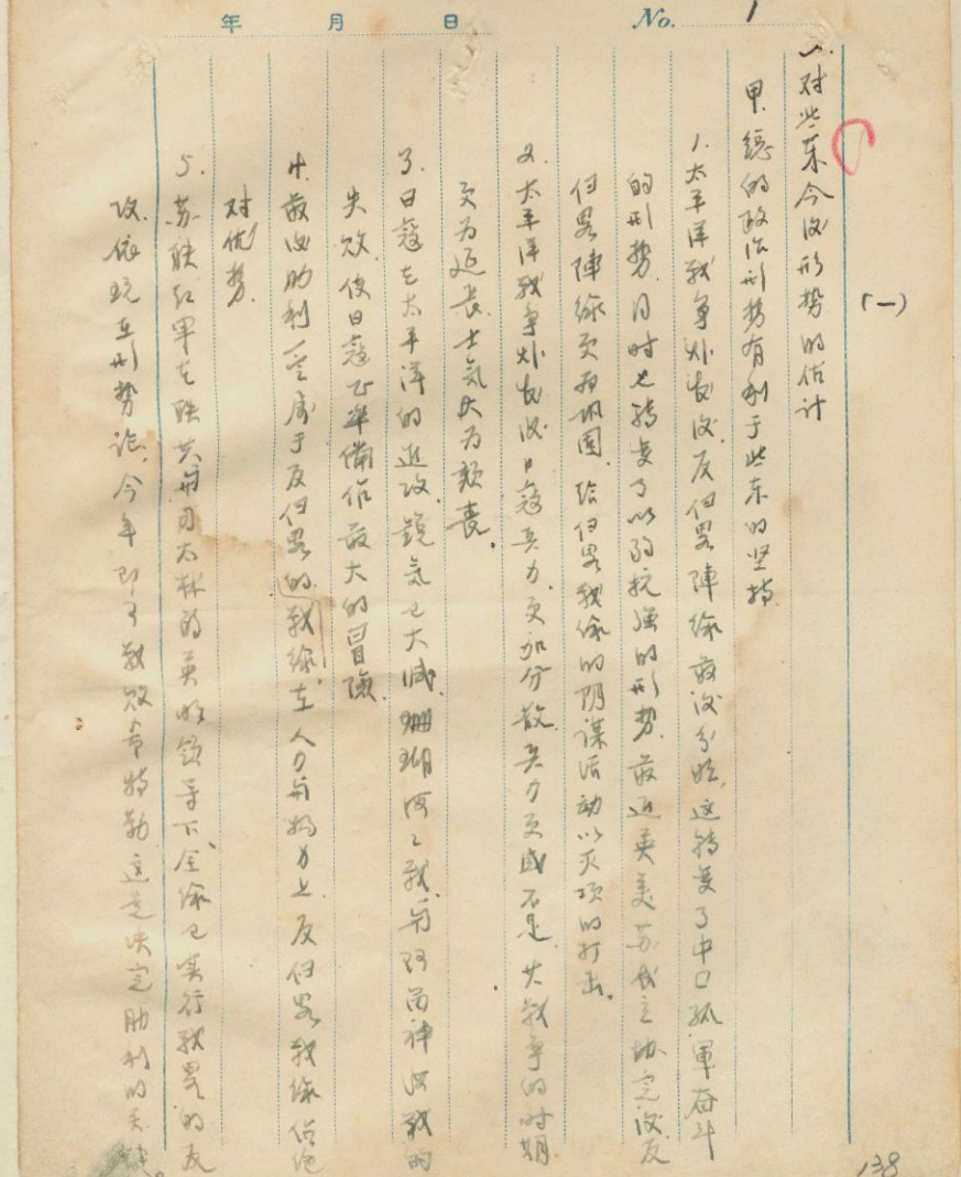 王少奇笔记中的“对冀东今后形势的估计”部分(天津市蓟州区档案馆藏)