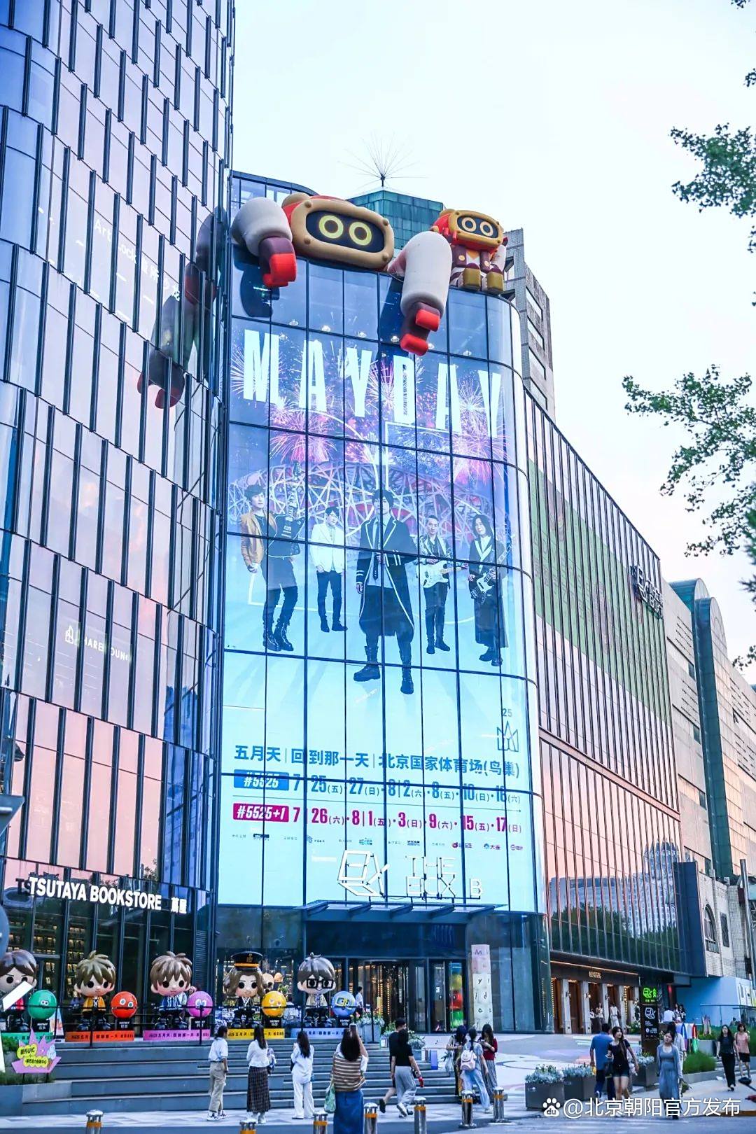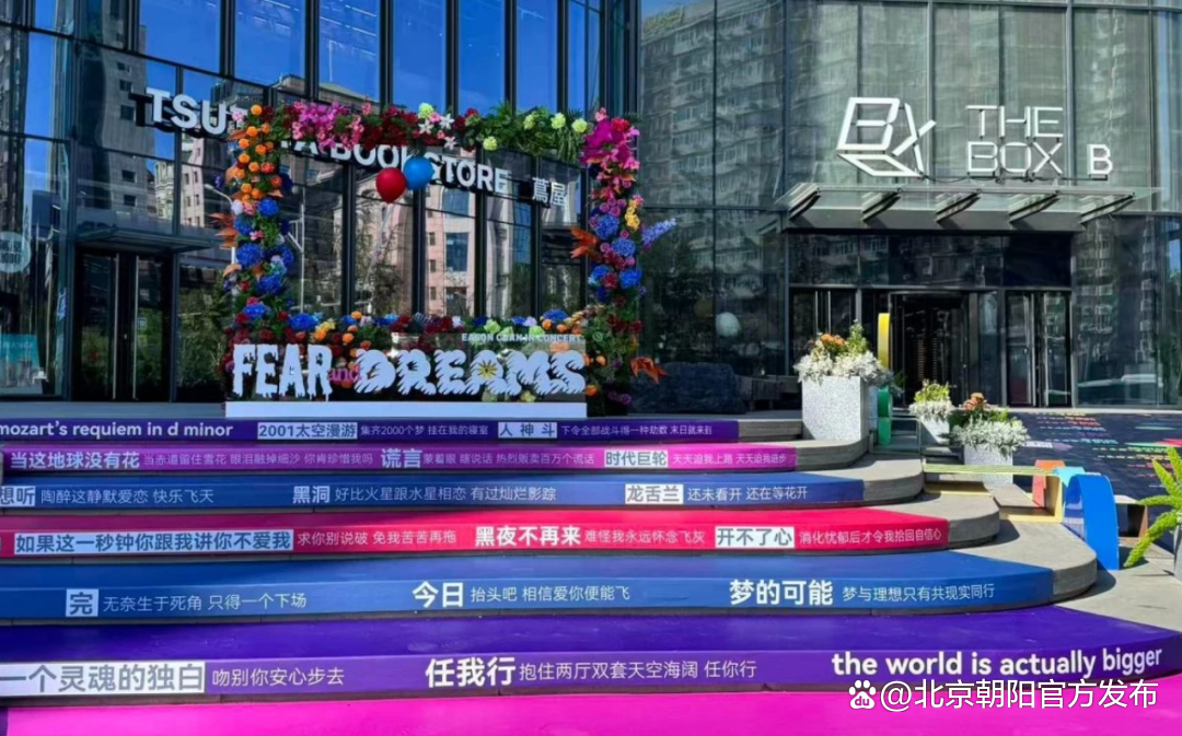 那段日子,朝外大街好像真的变成了一座沉浸式造梦工厂。台阶上写有经典歌词,电子屏上播放演唱会联动海报,就连楼内的商户也做了五月天联名产品……