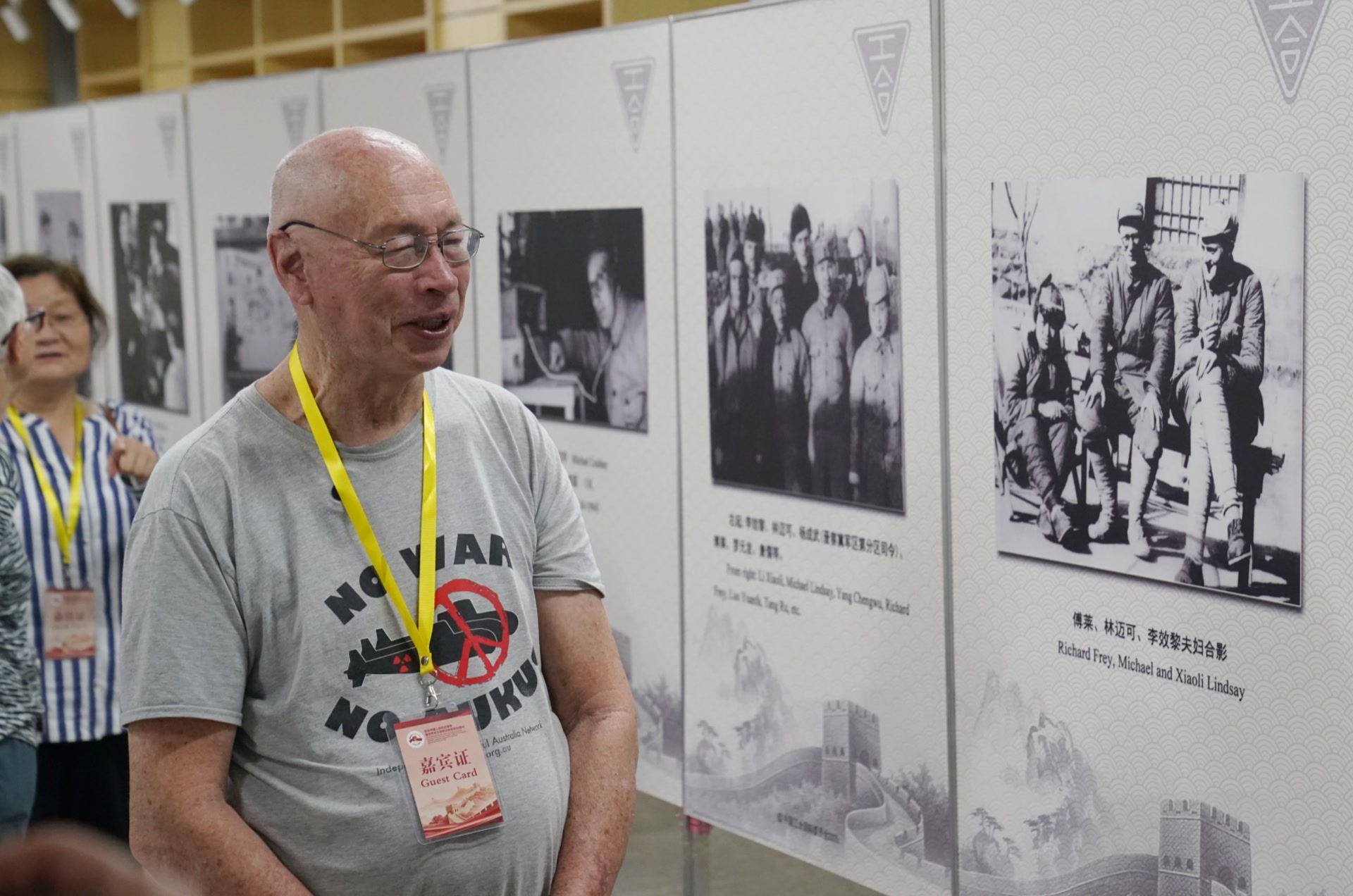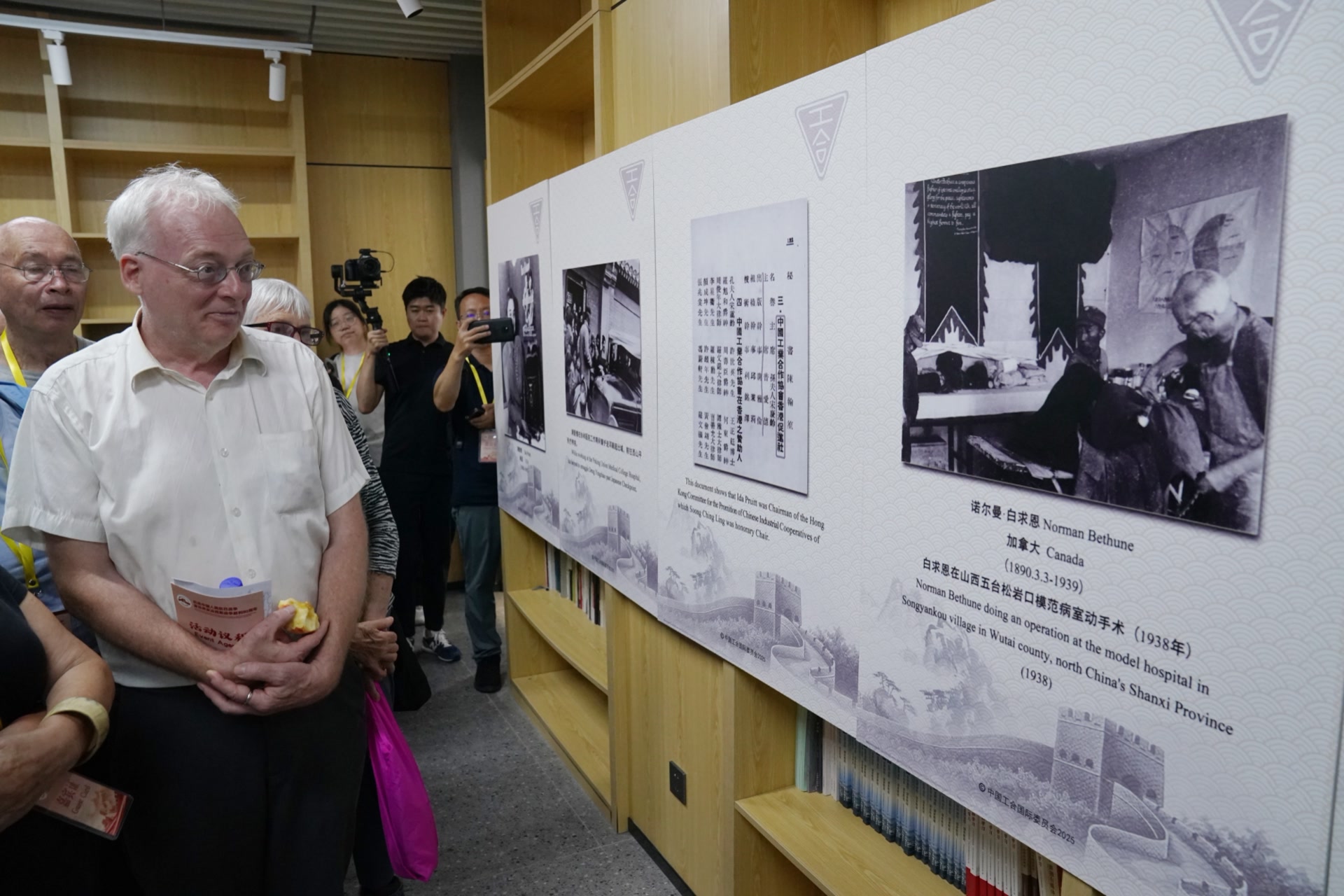 白求恩后人沃伦·白求恩观看《并肩战斗——世界反法西斯战争中的国际友人》展览中白求恩的照片