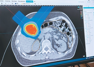 电脑屏幕上,一名80多岁的胰腺癌患者CT图像显示,胰腺位于腹腔中央,不仅紧挨着会蠕动移位的肠管,且患者体内还有多处会让射线衰减的金属高密度影,腹主动脉里植入了金属支架。这些特殊组织都必须在重离子束的“弹道设计”中精准避让。