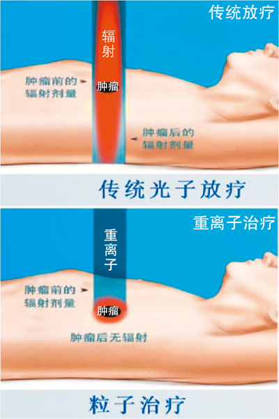 光子和粒子(包含电子、质子和重离子)治疗的辐射量差异示意图。重离子等粒子具有“布拉格峰”物理效应,能够在肿瘤靶区集中释放能量。受访者供图