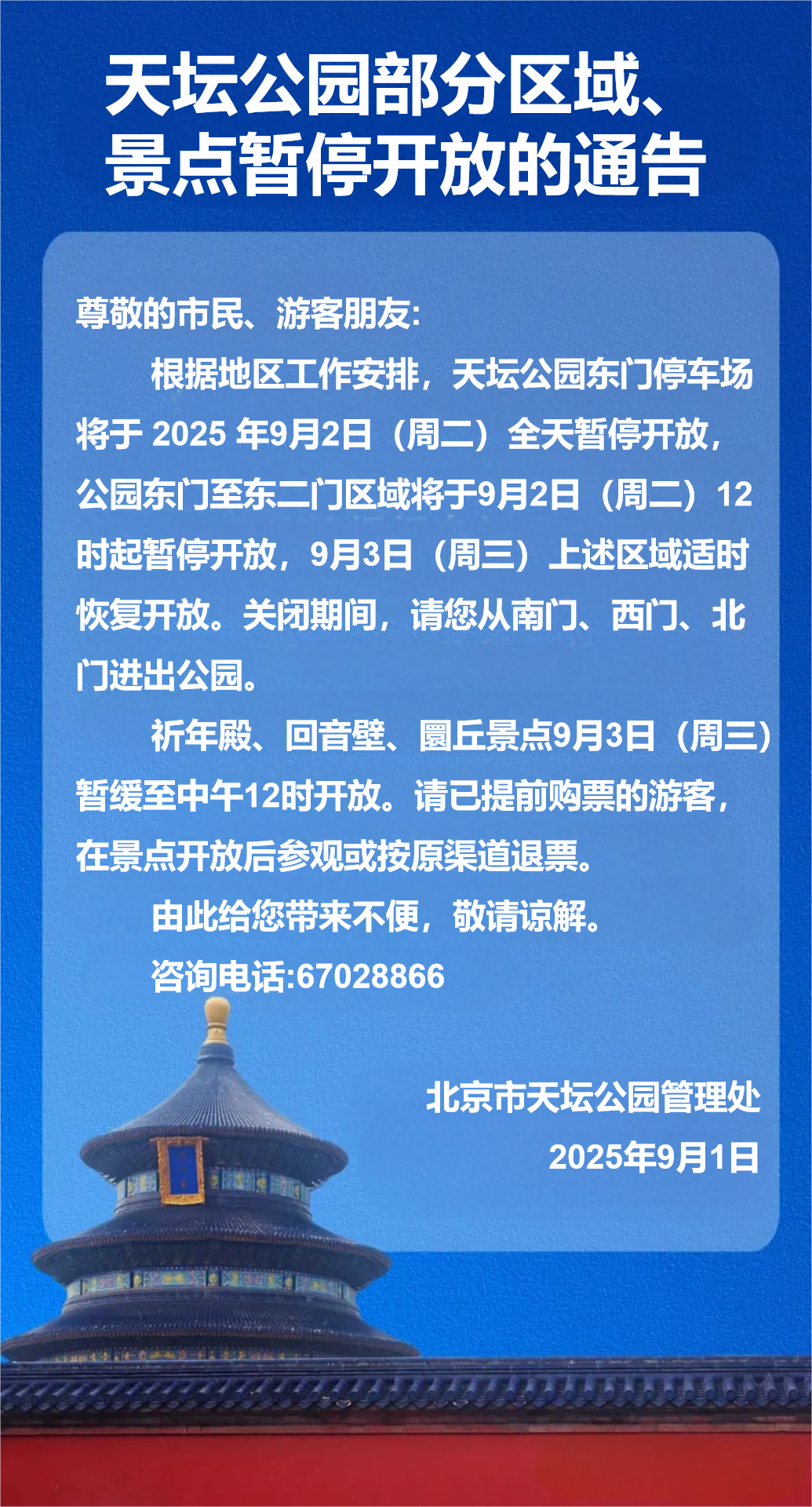 9月2日、3日,天坛公园部分区域、景点暂停开放