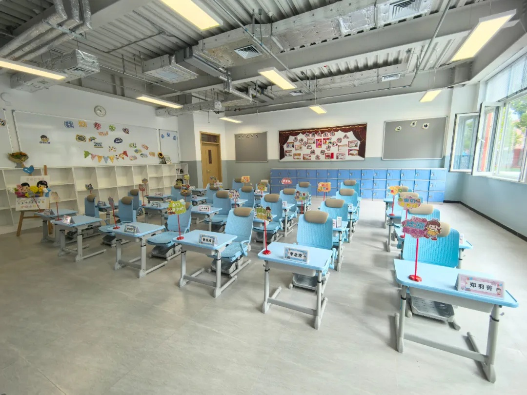 新校区配有音乐、舞蹈、劳动、科学、多媒体智慧教室等33个专用教室,育翔小学回龙观学校(北清校区)教育教学负责人衣琳老师介绍,今年从育翔小学回龙观学校本部校区共调派12位骨干教师,其中4人为高级教师组建成为北清校区师资团队。安全健康方面,校园配建了新风系统,护眼照明安全防护设施,并为每一位学生配备了可躺式的午休课桌椅。