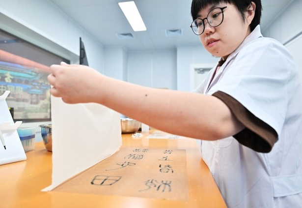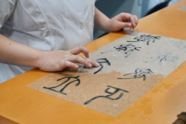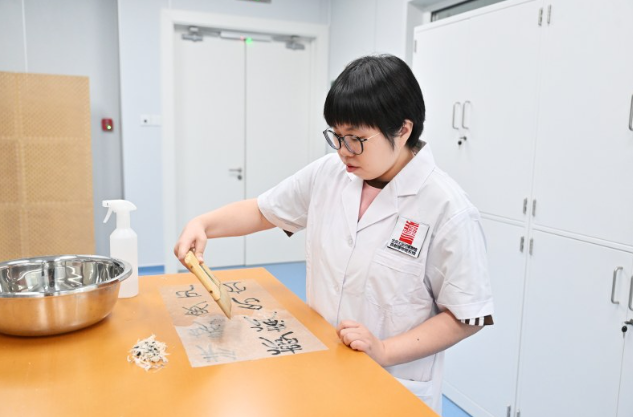 揭命纸是对一名文物修复师的终极考验。传统技艺中,要先将待修复的书画在工作台上展平,然后用水闷润,随后用手指一点点地蹭掉命纸,而书画文物的画心和命纸都是很薄的宣纸,再加上已经闷润,要求文物修复师要在上面“四两拨千斤”。不过,这难不住从事书画修复十余年的首都博物馆文物修复师任静怡,只见她用右手中指轻轻划过书画,一片片纸屑便从中脱落,而下面的画心毫发无损。不过,看似轻松,实则不易。任静怡说:“如果是一幅更长的书画,光是揭就要进行一个月,这要求文物修复师沉得住气,绝对不能急躁。”