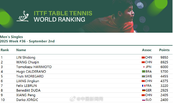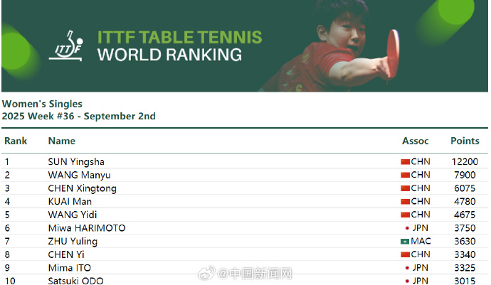 9月2日,国际乒联公布2025年第36周排名。女单:孙颖莎、王曼昱、陈幸同、蒯曼、王艺迪位列前五,陈熠第8。男单:林诗栋、王楚钦位列前二,梁靖崑位列第6,向鹏位列第9。
