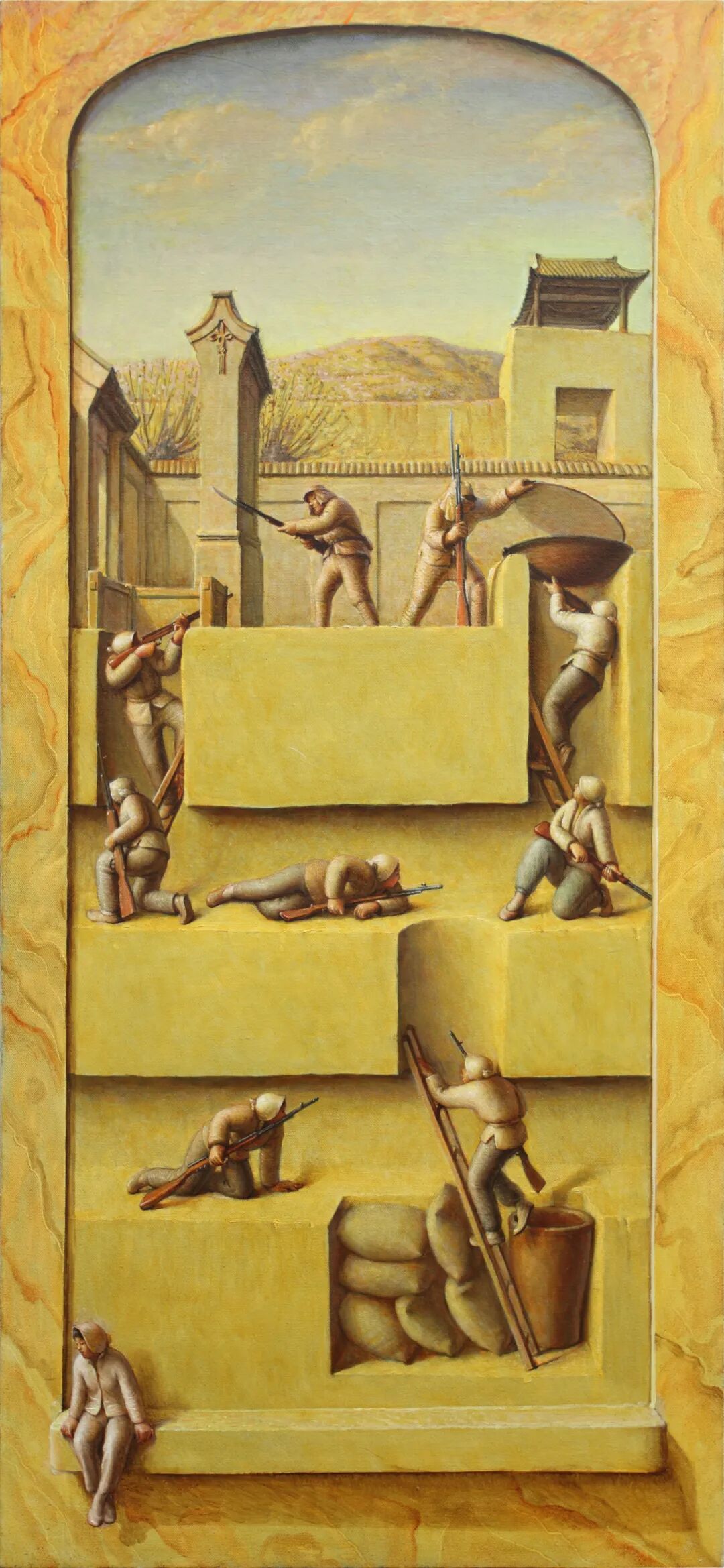 该作品表现了抗日战争时期华北地区著名的地道战主题,以剖面视角描绘了地道内部的复杂结构和地面上的场景,表现了抗日军民在党的领导下,依靠自己的聪明才智发明出地道战战法,神出鬼没地打击了日寇,使其消灭于人民战争的汪洋大海之中,体现了中国军民保家卫国的决心和不可战胜的钢铁意志。