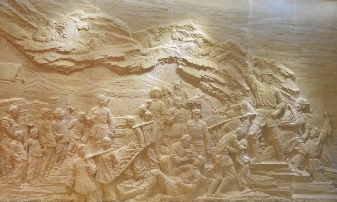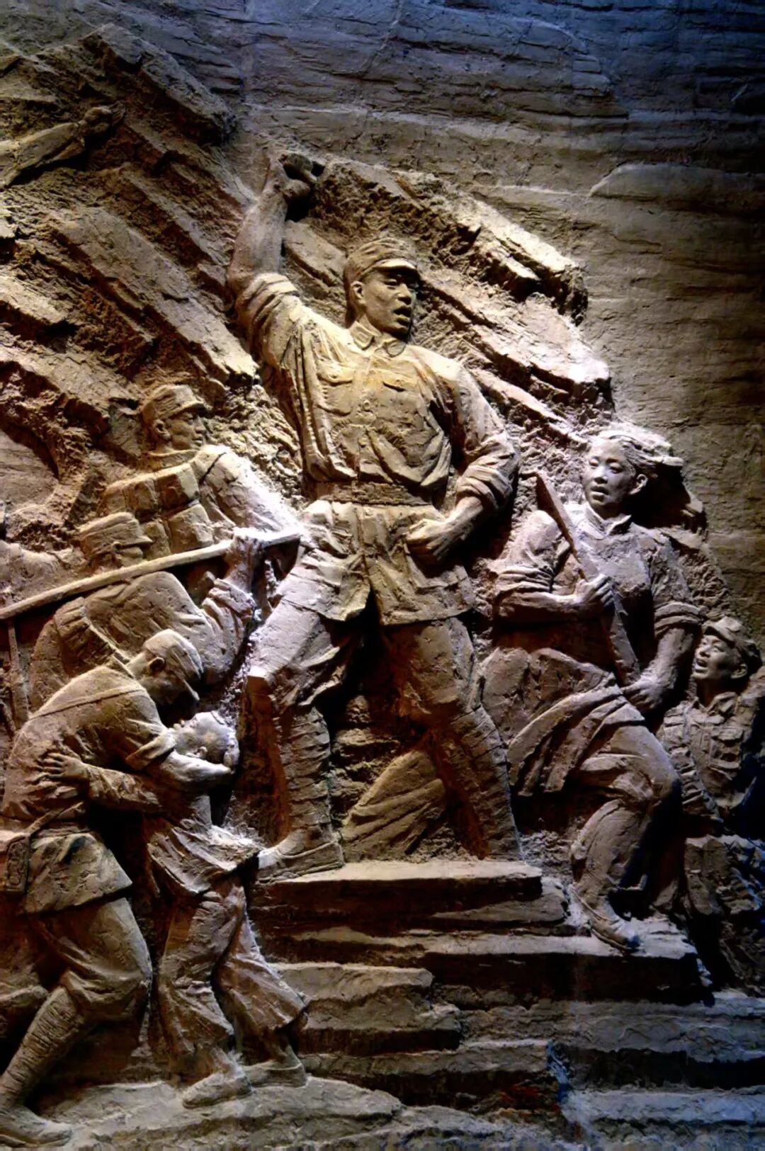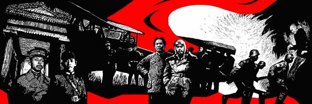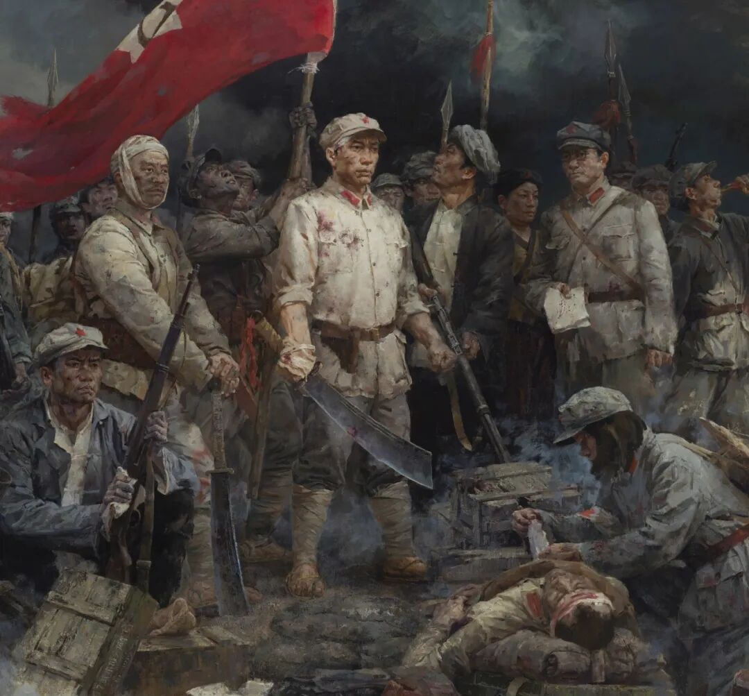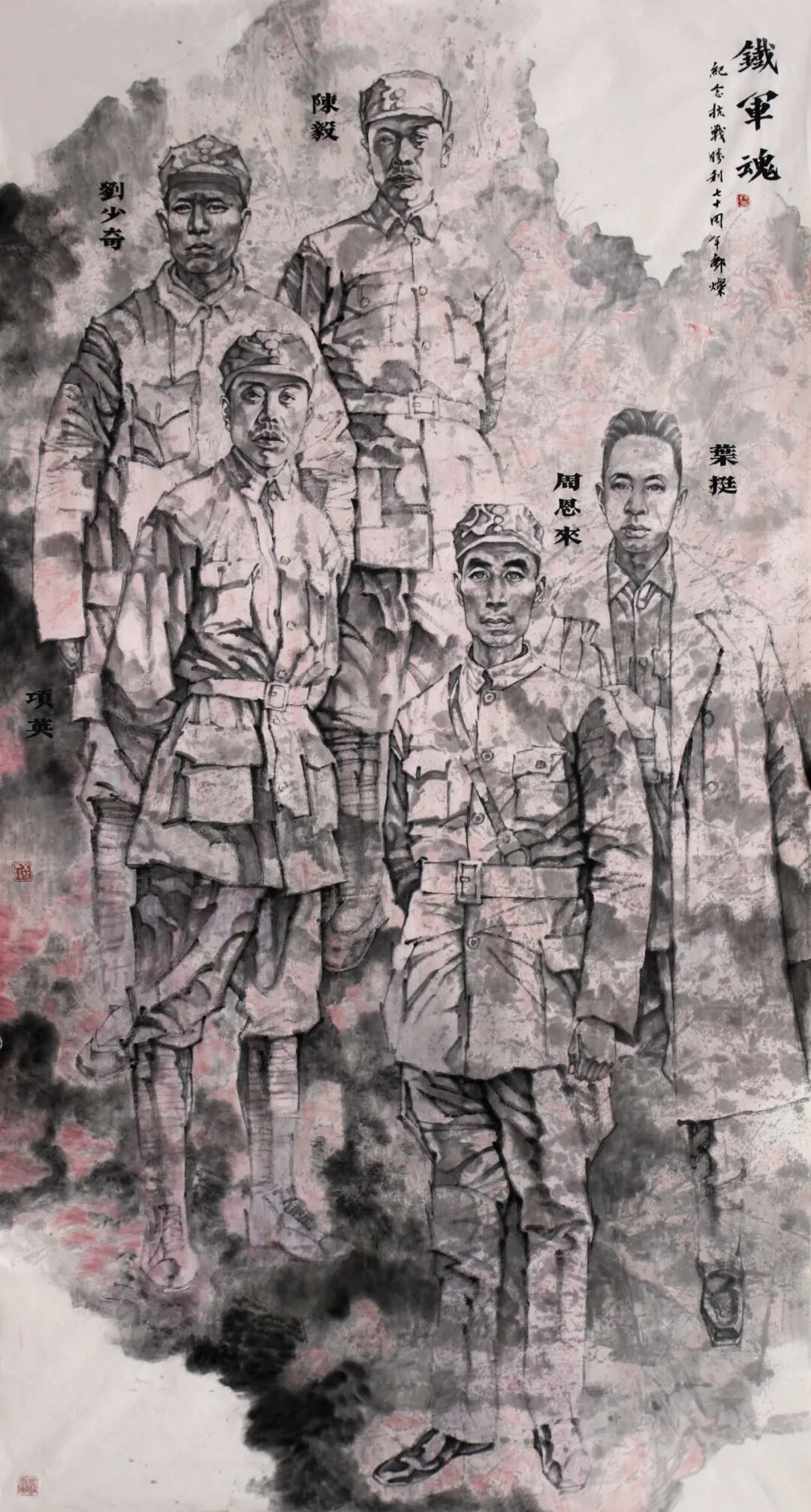 新四军的成立是抗日战争民族统一战线的重要成果之一,是中国共产党直接领导的抗日武装力量,有效牵制和打击了日伪军,配合正面战场作战,为抗日战争的胜利作出了重要贡献。作品描绘了新四军的主要将领周恩来、叶挺、项英、刘少奇、陈毅。背景的处理表现了战火纷飞的残酷岁月,与人物坚毅、自信的精神状态相得益彰。他们带领新四军在艰苦的环境中坚持抗战,展现了中国人民不屈不挠的民族精神。