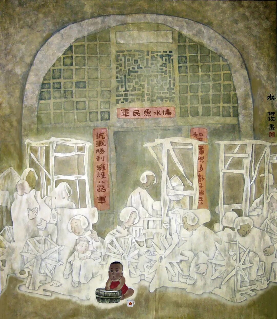 《水》为一幅宣纸设色的小写意画作,描绘了抗日战争时期后方百姓为前线将士纺线织布的动人场景。作品以“水”为名,寓意军民之间的鱼水情深,深刻揭示了抗战的胜利源于全体中国人民的团结与奉献。