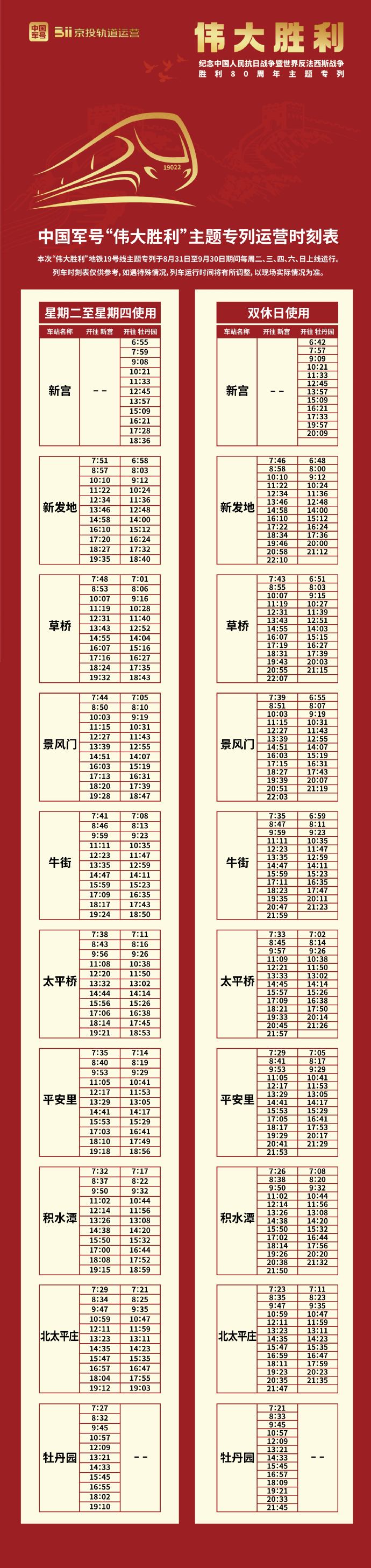 本次“伟大胜利”地铁19号线主题专列于8月31日至9月30日期间每周二、三、四、六、日上线运行。