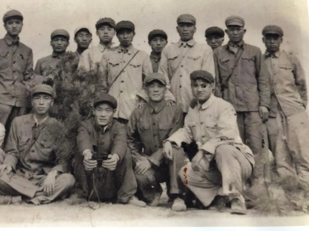 1953年5月15日在朝鲜前沿阵地营指挥所召开营党委扩大会议,距离板门店4公里,在坑道口前全体留影。(前排左二为王凤和)