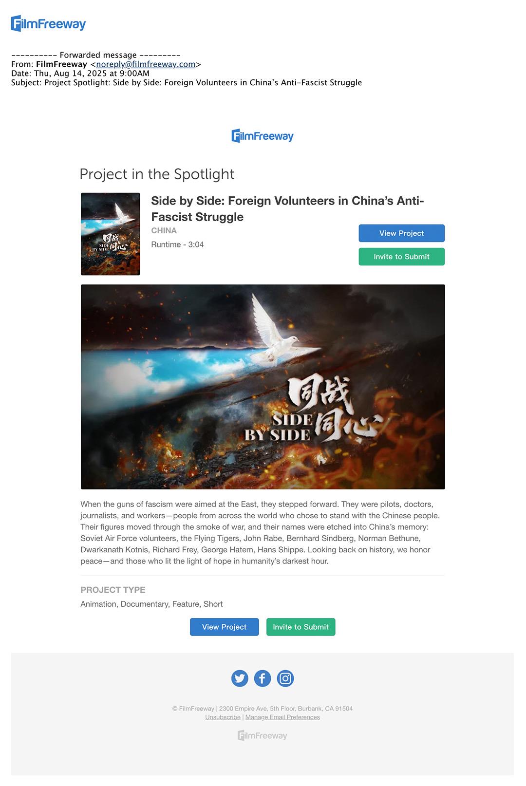 该片获得广泛国际关注。包括美国福克斯新闻网、《华盛顿城市报》、英国《金融时报》、法国《费加罗报》及东南亚多国主流媒体发布专题片融媒体碎片产品。中国驻美国大使馆、中国驻日本新泻总领事馆在海外社交媒体官方账号对该片进行转发。8月30日,专题片在美国旧金山举办的纪念活动上放映,该活动由美国卡特中心、美国海外抗日战争纪念馆及大黄蜂号航空母舰博物馆联合主办,中国驻美大使谢锋以视频方式致辞,包括史迪威将军外孙约翰·伊斯特布鲁克在内的近400名中美抗战亲历者后代及各界代表出席观看。该片后续还会在美国海外抗日战争纪念馆大屏幕持续展映。