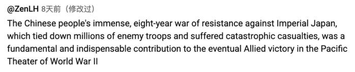 网友@ZenLH直言:“中国牵制百万日军的牺牲,是太平洋战场盟军胜利的关键。”