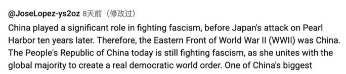 网友@JoseLopez-ys2oz感慨:“珍珠港被袭前十年,中国就已在为世界反法西斯而战。”