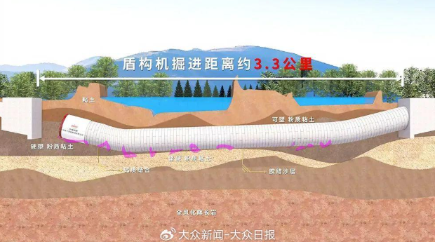 该隧道采用世界在建最大直径泥水平衡盾构机“山河号”施工,先后下穿黄河大堤、黄河等敏感地区,最深覆土厚度达49.2米,最大水土压力6.3巴(巴=100000帕)。针对黄河之下的复杂地质条件,项目团队依托丰富穿黄经验,为“山河号”盾构机创新应用大开口率带压复合型刀盘,装配伸缩式主驱动、开挖仓伸缩摄像头等先进装备,并搭载“五官一脑”智能化装备系统,构建盾构掘进的“智慧大脑”,实现全流程感知、预警与智能决策。