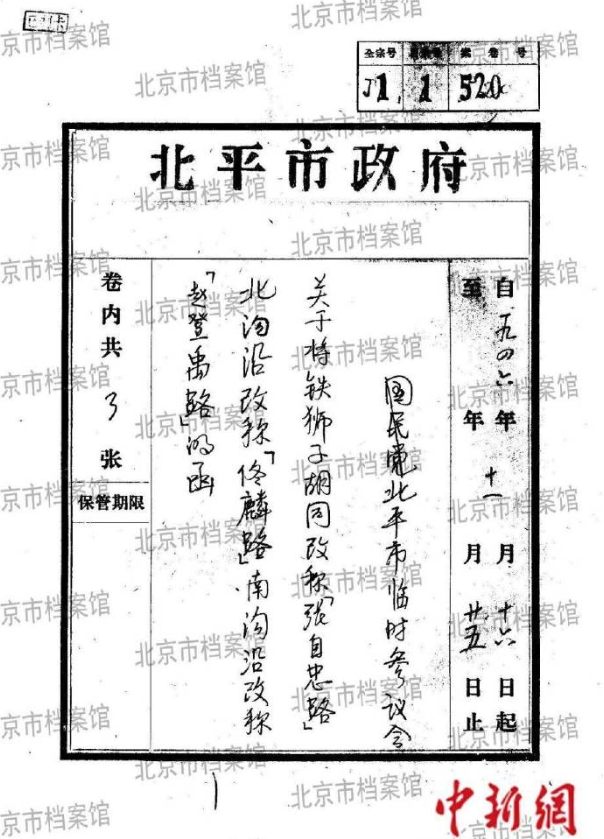 “这三条街道的命名,是抗战胜利后北平人民对英雄的最高致敬。” 北京市东城区委党史工作办公室专家胡澄手持档案复印件介绍道,这三条街道正式命名是在1947年的3月,由时任北平市市长何思源签署训令正式命名的。而这个提议是由当时北平市临时参议会在1946 年提起公议的,经会议通过后才由市长签署训令正式命名。