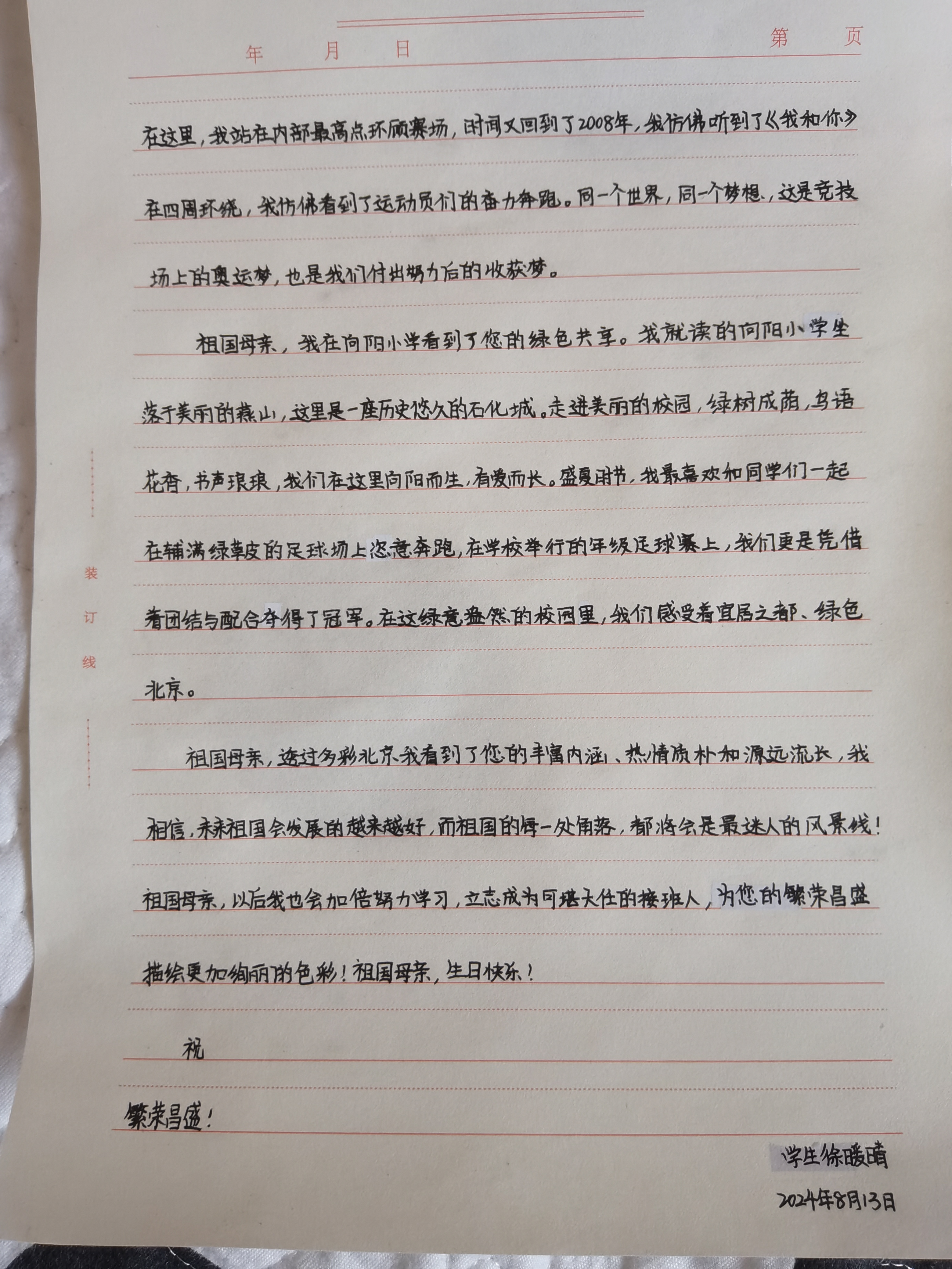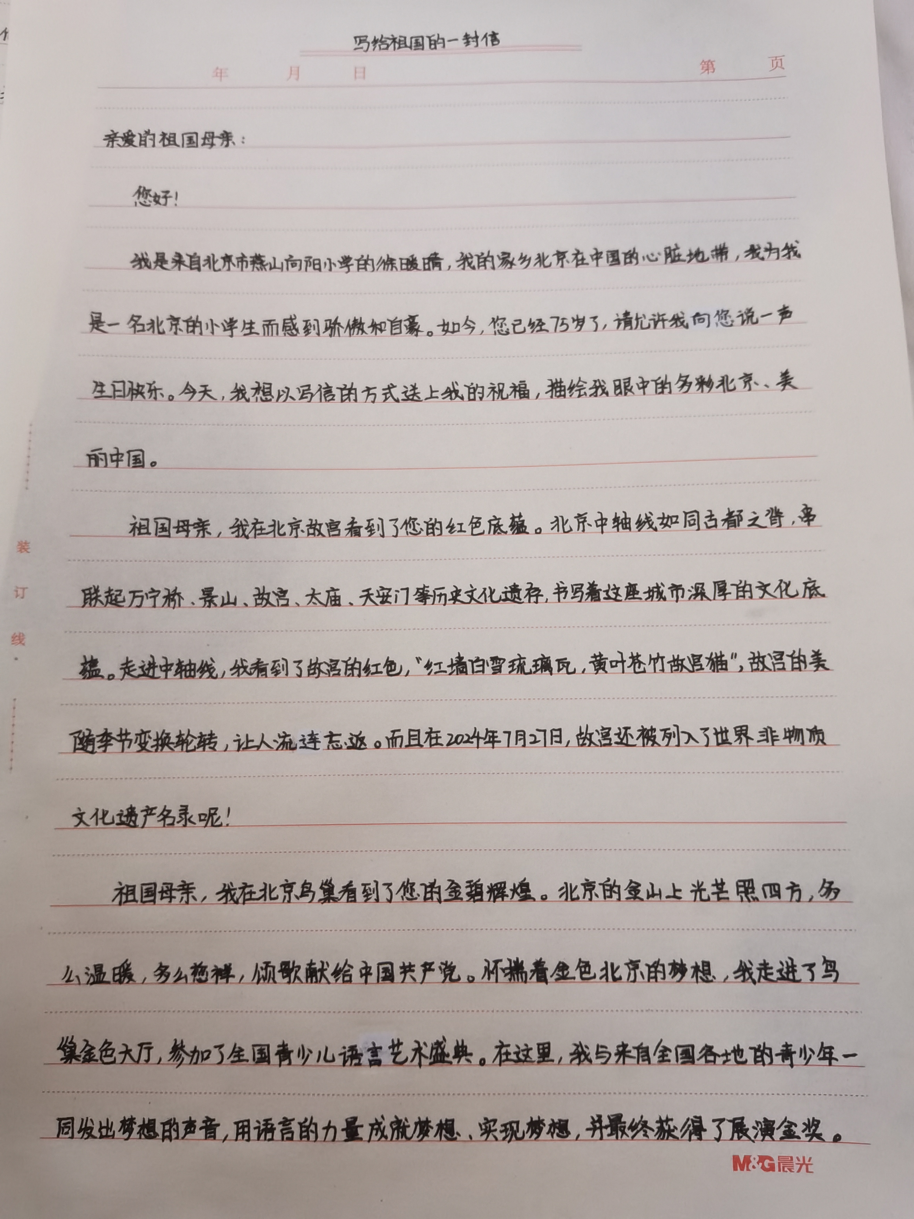 今天这幅AI绘画作品的原型来自北京市燕山向阳小学四年级(4)班徐暖晴的书信作品《写给祖国的一封信》。