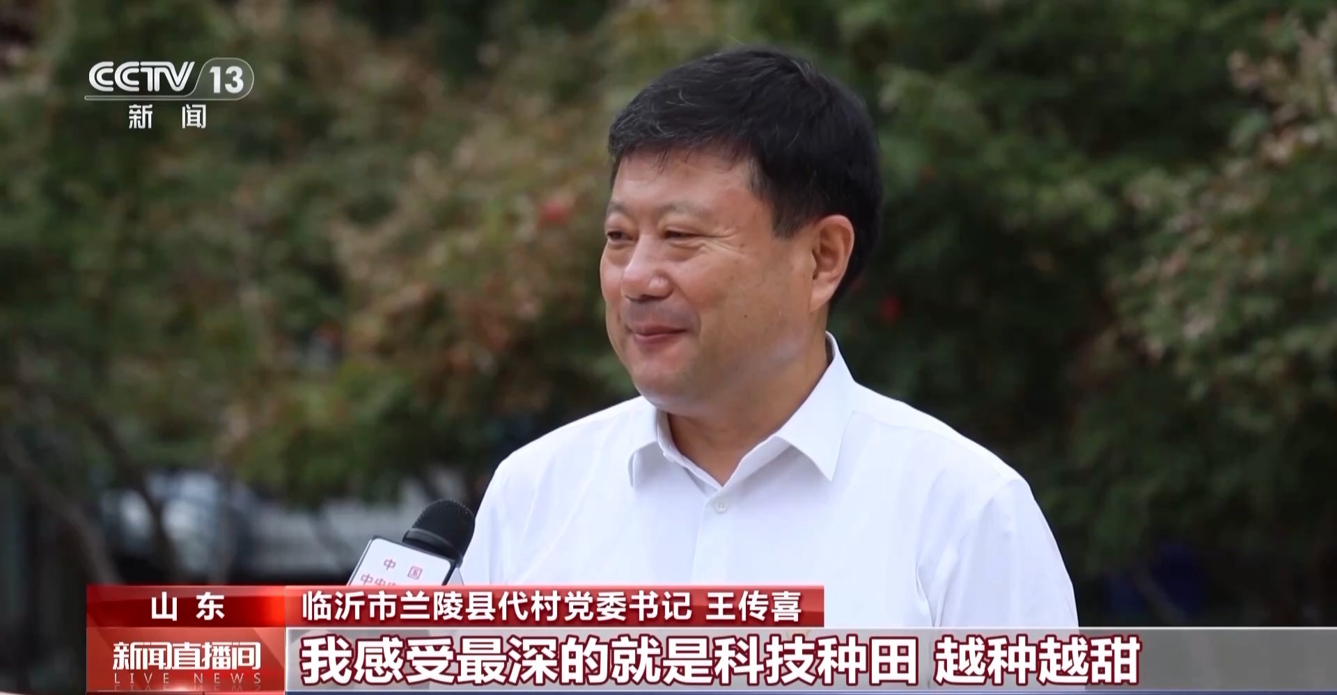 临沂市兰陵县代村党委书记 王传喜:我是一名农村党组织书记,在农村工作了20多年。我们村一直在做现代农业,村民就在科技大棚里工作,种地不沾土,告别了“脸朝黄土背朝天”的生活,这来源于科技强国,农业强国战略的支撑,我感受最深的就是“科技种田、越种越甜”。