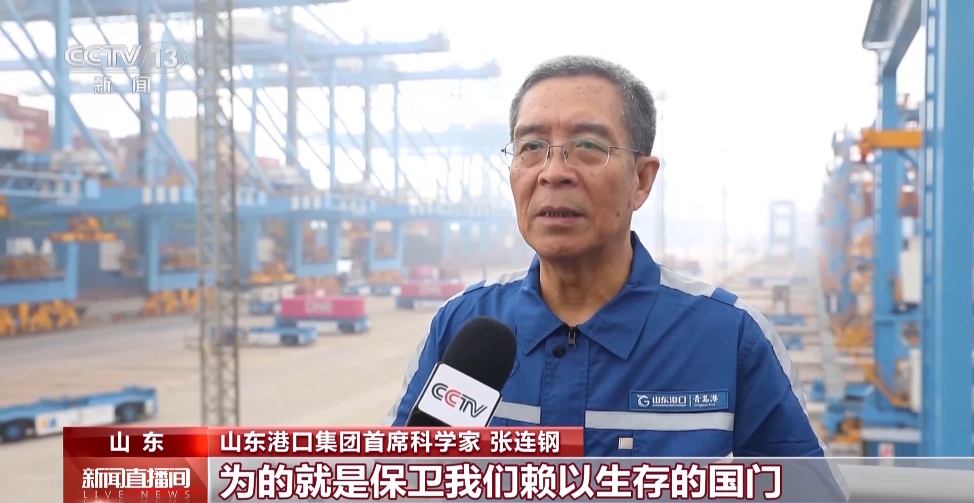 山东港口集团首席科学家 张连钢:80多年前,无数先辈用血肉之躯,筑起了抵抗侵略的壁垒,为的就是保卫我们赖以生存的国门,而今天我们站立的地方,已经从当年的国门防线,变成了国家走向世界,拥抱全球的开放枢纽,先辈用生命换来了国家的独立和主权,而我们的使命,就是要用科技和智慧,保障国家经济的命脉畅通,让国门更安全更高效更智能。