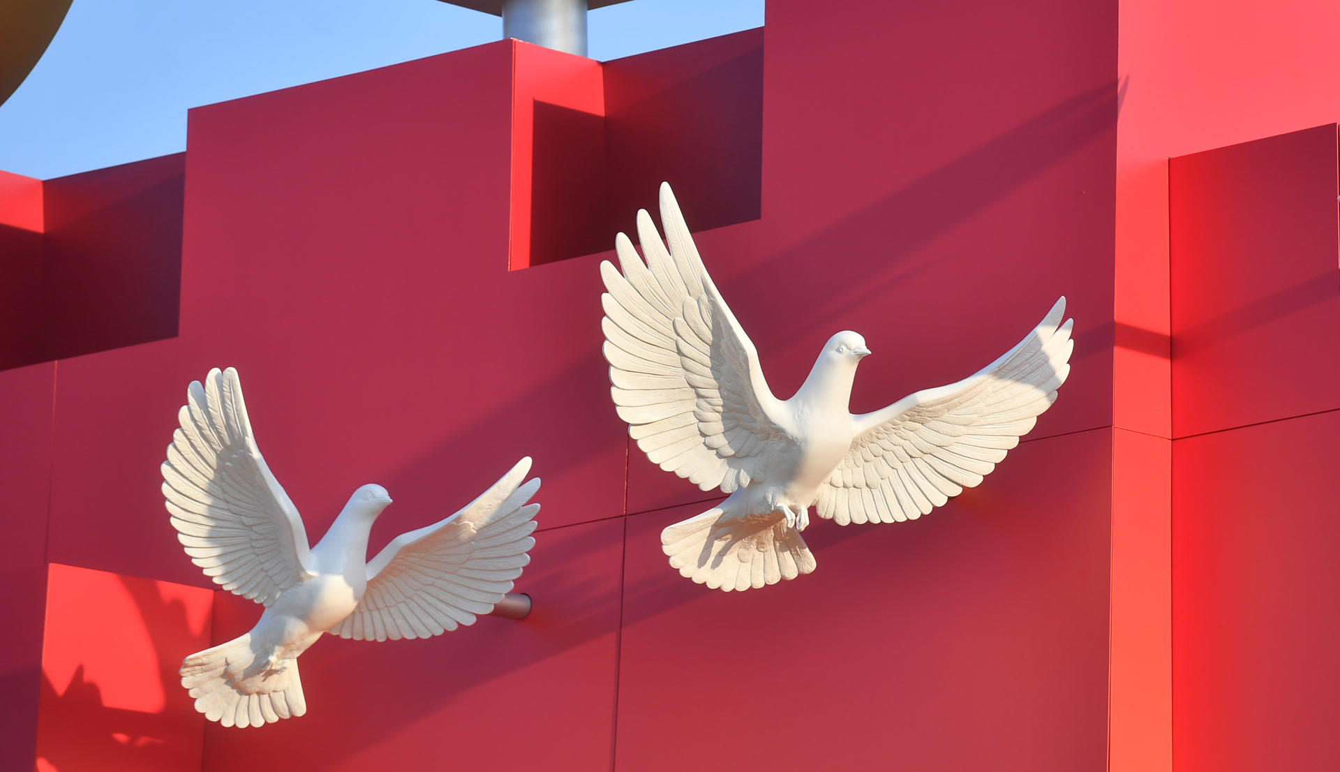 从半空中看去,“众”字造型观礼台沿中轴线红毯向南聚向“钢铁长城”造型年号台,并延伸汇聚向人民英雄纪念碑,寓意在中国共产党领导下,中国人民同反法西斯同盟国以及各国人民并肩战斗夺取抗战伟大胜利。