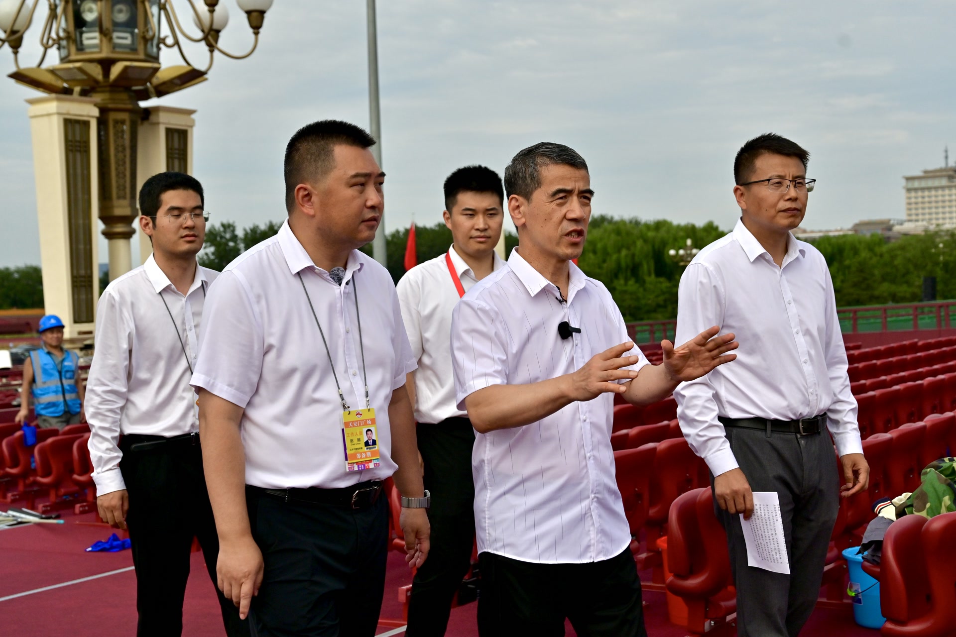 田忠利介绍,策划设计部接到任务后,组织9家设计团队参与广场现场布置方案设计,在数百稿方案中最终选定中央美术学院提供的设计方案。设计团队研读史料资料,从习近平总书记在纪念中国人民抗日战争暨世界反法西斯战争胜利75周年的座谈会上提出的“中国人民抗日战争胜利是全民族众志成城奋勇抗战的伟大胜利”论述中,提取“众志成城”这一概念,作为广场核心区整体设计的主题,并选择象征中华民族精神的长城、“三人为众”的意象表达作为主要元素,让公众实现共情、共鸣、共识。