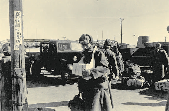 侵华日军缴械后,在1945年底陆续离开中国。图为一个投降后的日军士兵在丰台火车站准备离开北平。他胸前挎着的是同伴的骨灰。旁边电线杆上贴着中国军队的抗战胜利标语“民族解放大业成功”。
