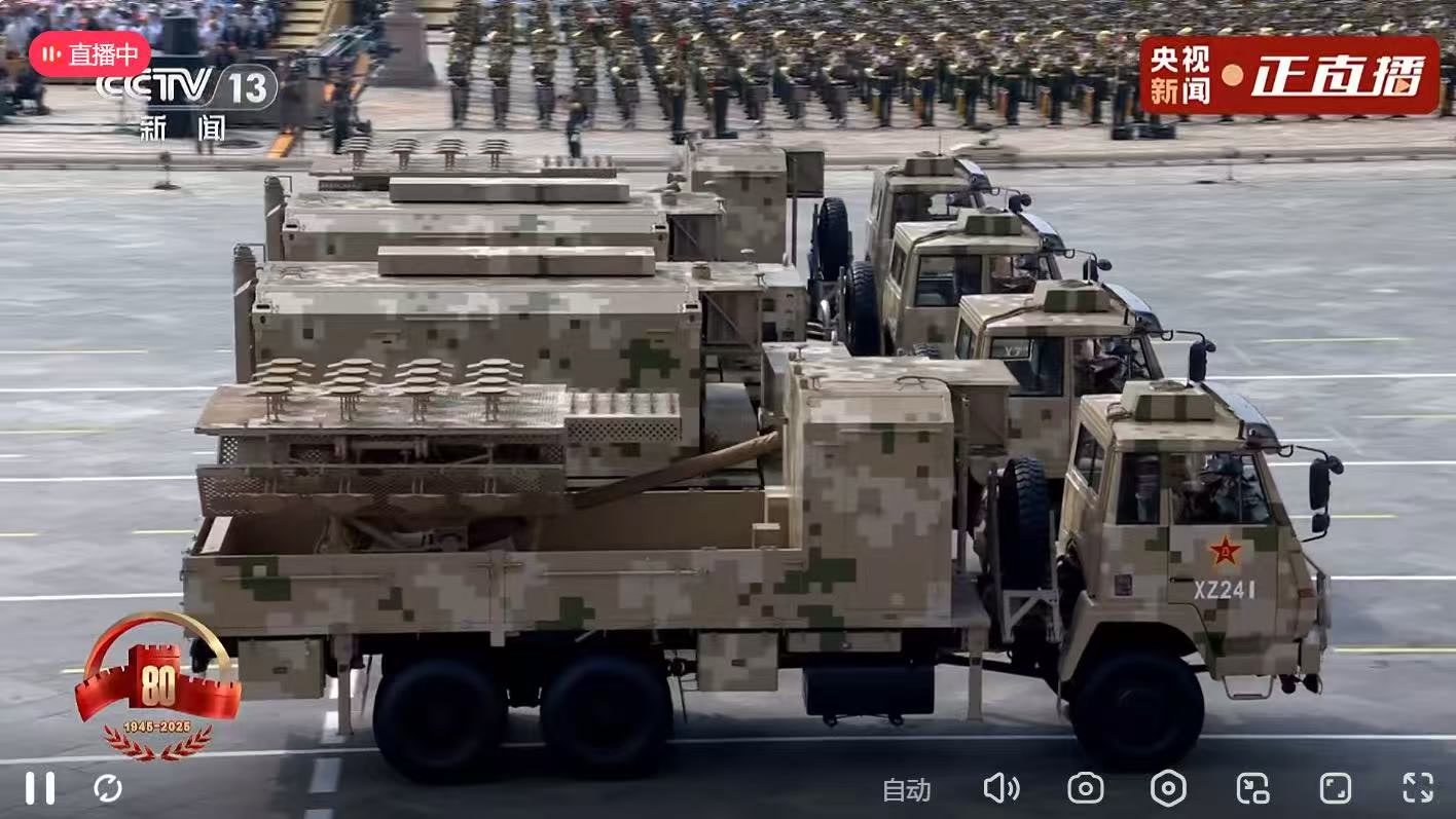 电子对抗方队接受检阅。受阅的5型电子对抗骨干装备,具备空天防抗、破网断链作战能力,是制胜多域联合战场的利器。