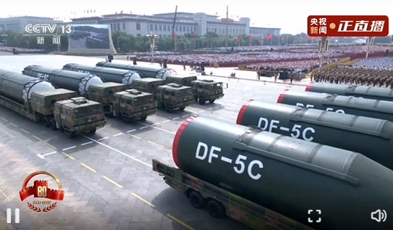 12台大型导弹运输车载着“东风-5C”液体洲际战略核导弹浩荡而来。核导弹第二方队是装备方队压轴出场的方队。