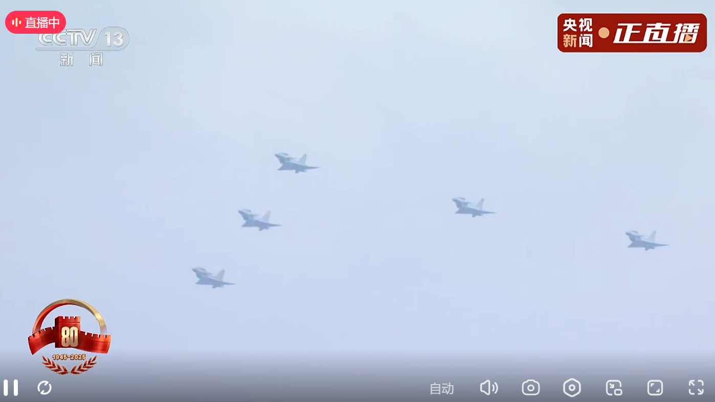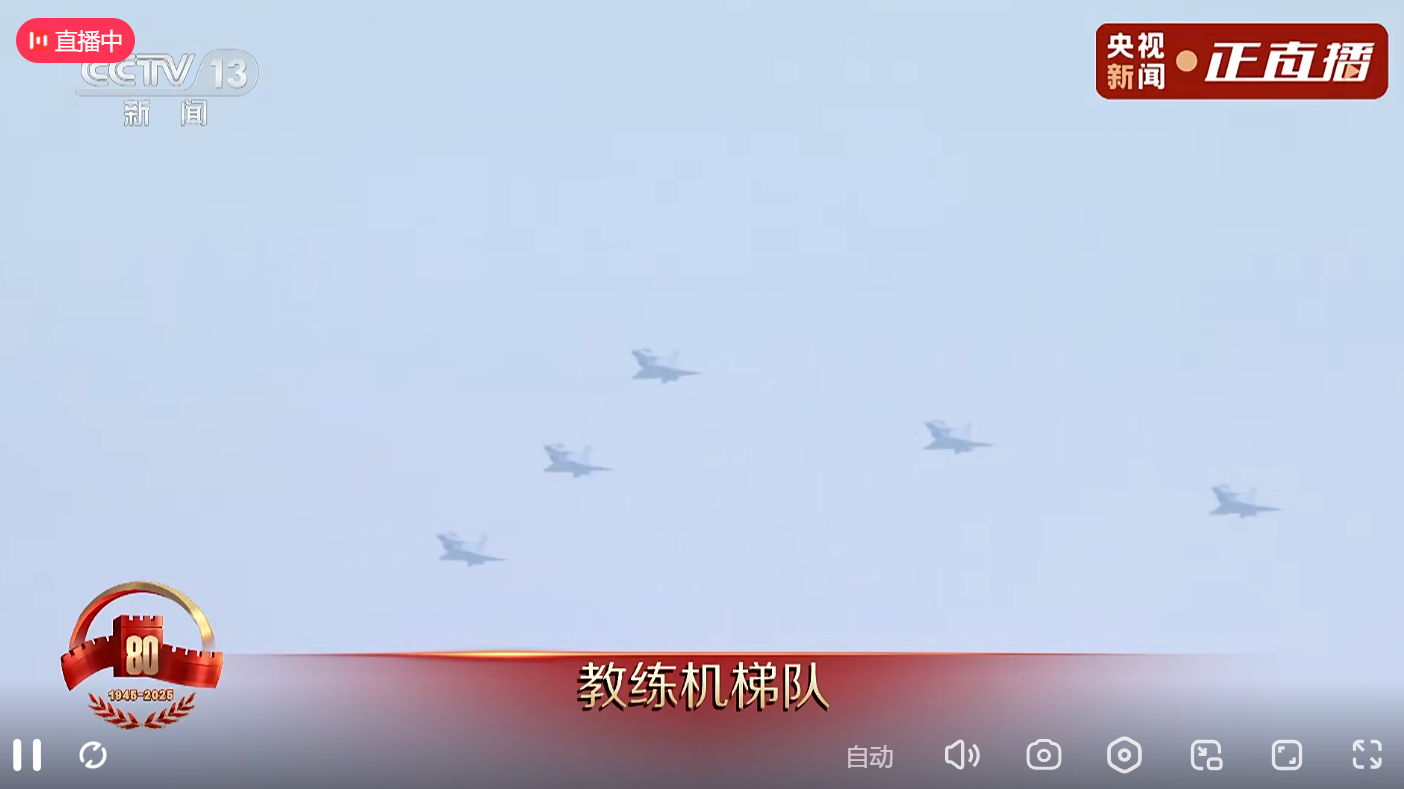 9月3日上午,由5架教-10飞机、5架歼-10S飞机、7架歼-10表演机组成的教练机梯队压轴出场,接受祖国和人民检阅。