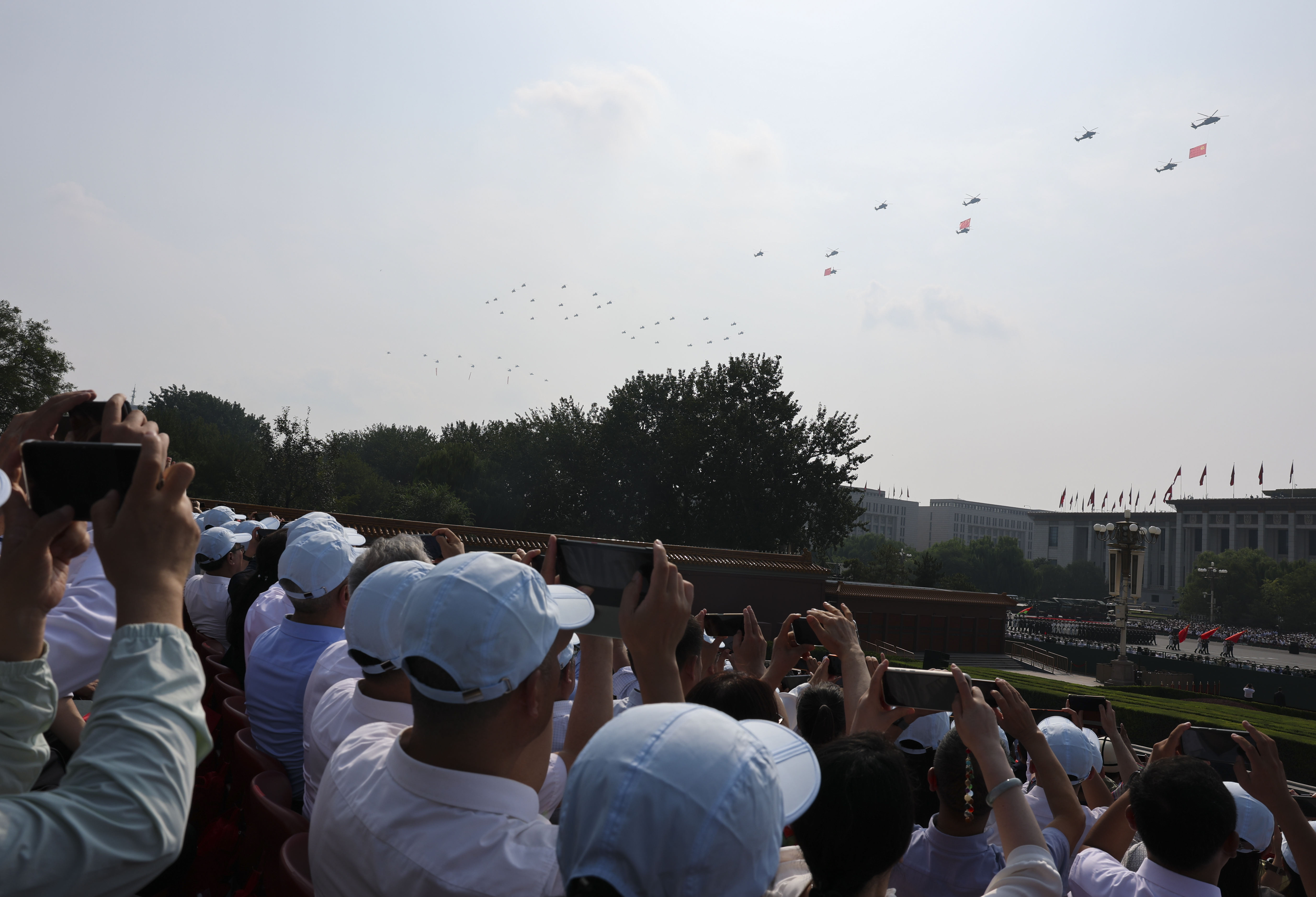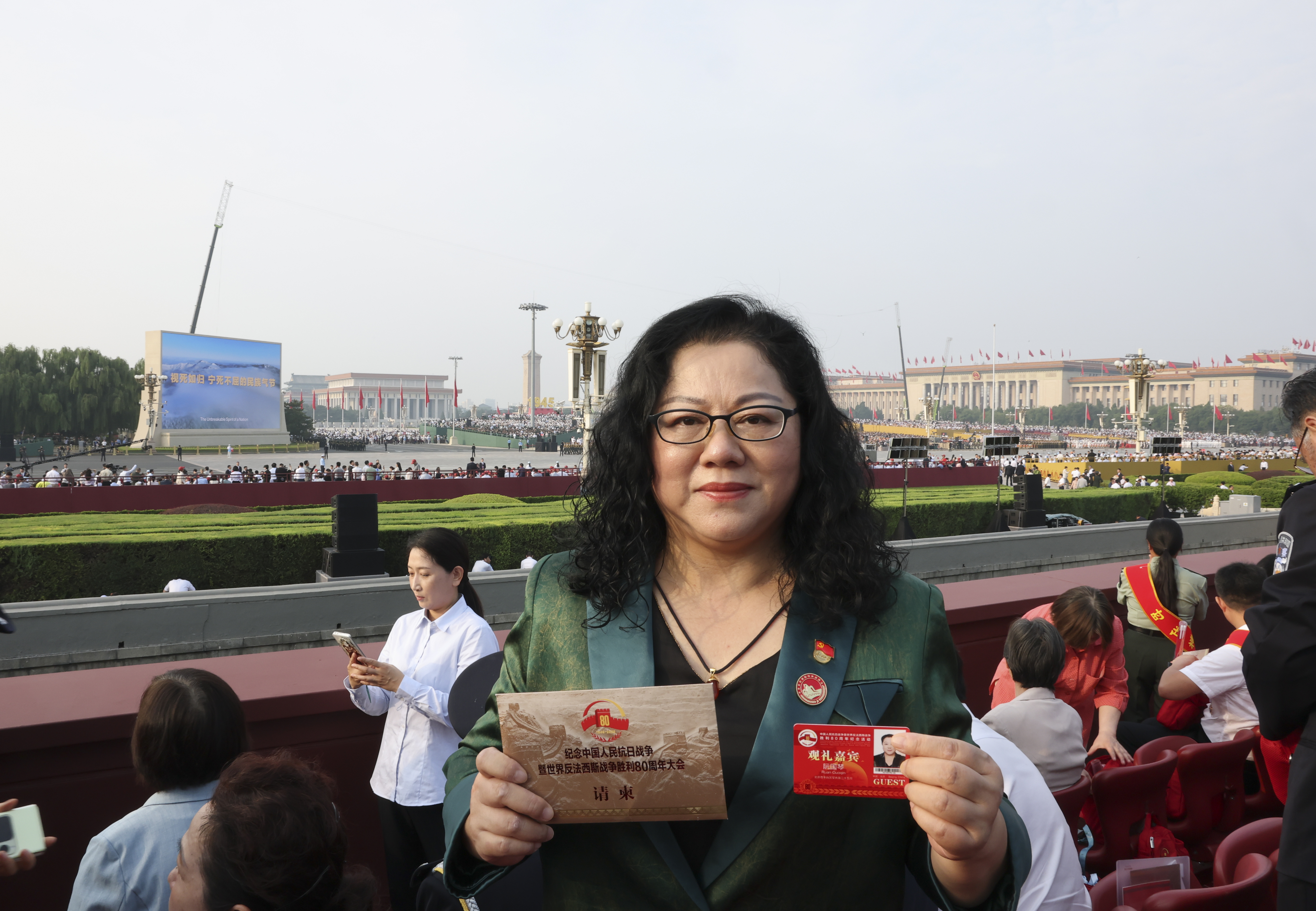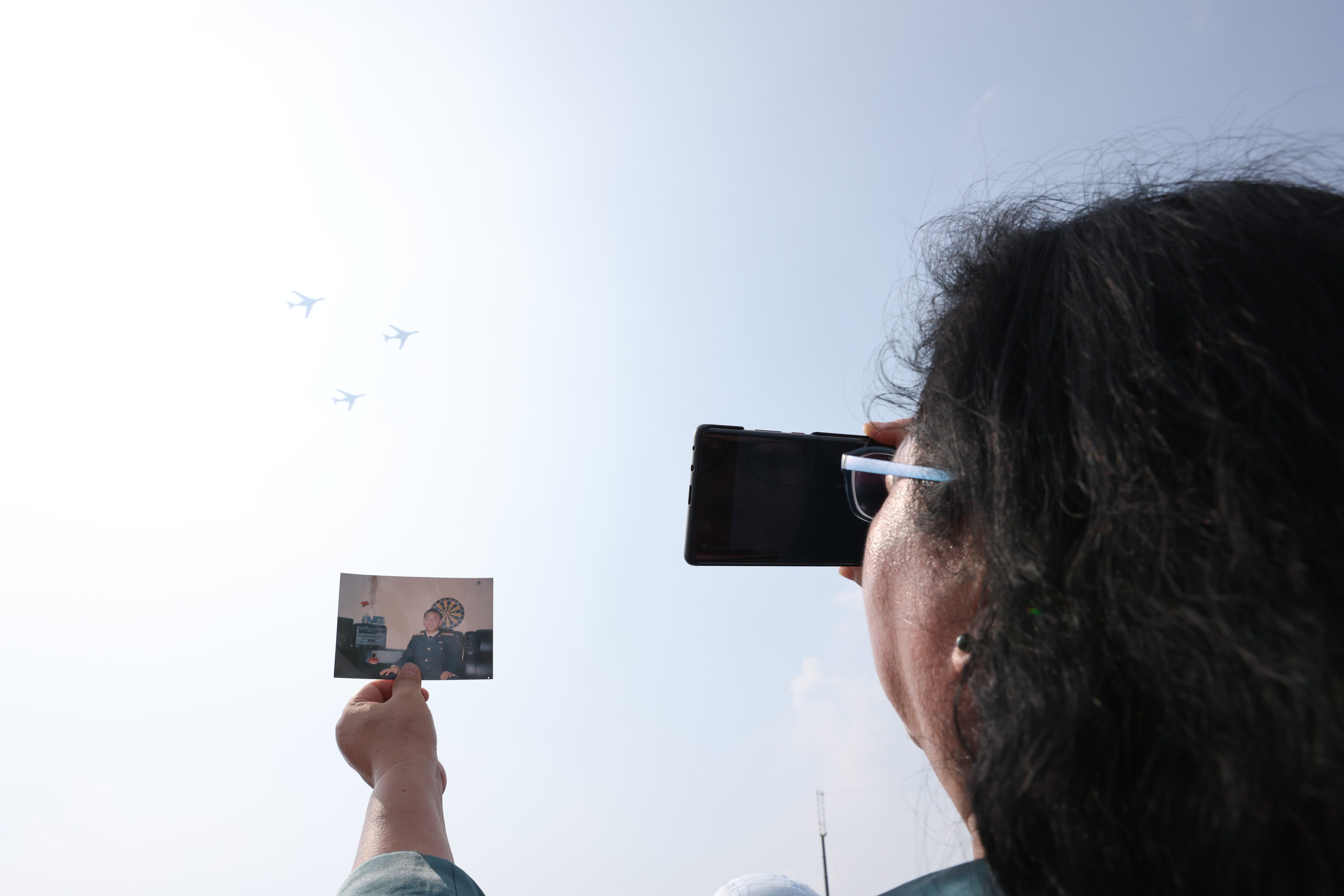 9月3日,纪念中国人民抗日战争暨世界反法西斯战争胜利80周年大会在北京天安门广场隆重举行。当空中梯队飞过天安门广场时,“海空卫士”王伟的妻子阮国琴在观礼台上把王伟的照片举向蓝天,她大声说:“王伟,你和战友们又见面了!”