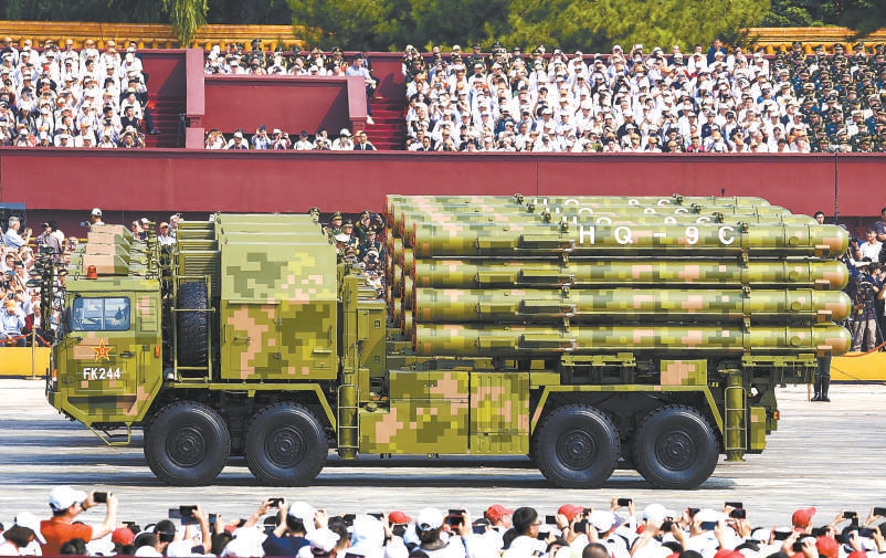 随后受阅的对空抗击方队,红旗-20、红旗-19、红旗-29等6型装备,全部由我国自主研制设计生产,可实施多段多层反导拦截,主要用于拦截直升机、飞机、导弹等目标,构筑起防空御天的坚固屏障。