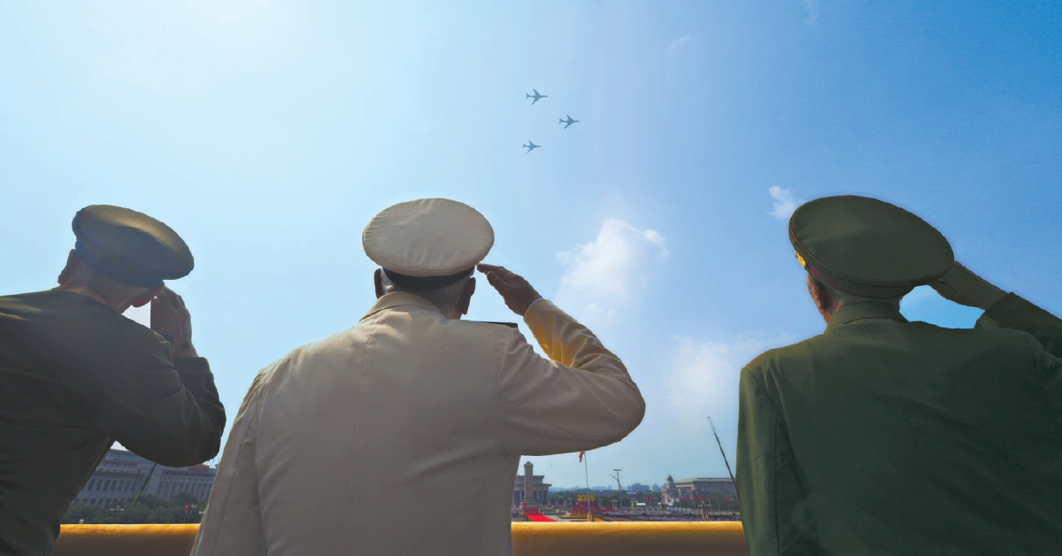 轰炸机梯队飞过天安门广场上空时,参加过抗战的老战士敬礼。 新华社发